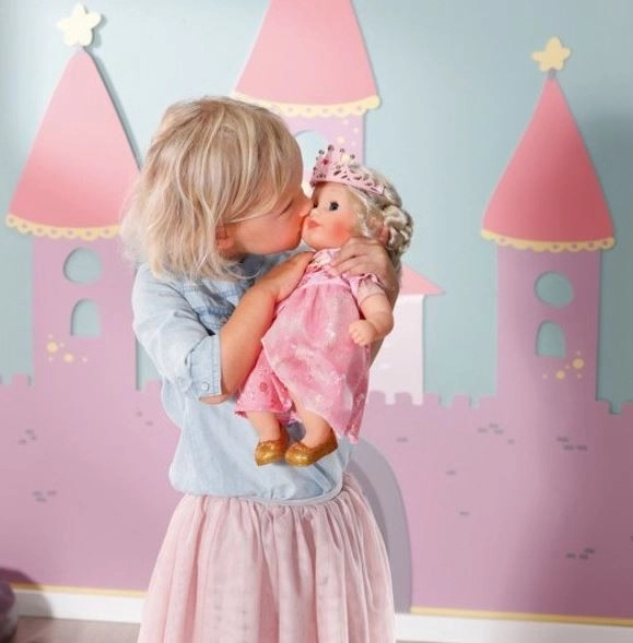 Ispod ružičaste haljine s til volanom blistaju zlatne balerinke, koje zaokružuju njezin kraljevski izgled. Zahvaljujući lako pristupačnom kroju haljine “easy fit”, presvlačenje je igračka čak i za najmanje dječje ručice. Lutka podržava razvoj kreativnosti i odgovornosti kod djece već od jedne godine.