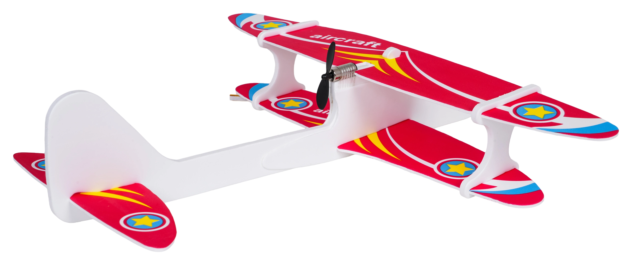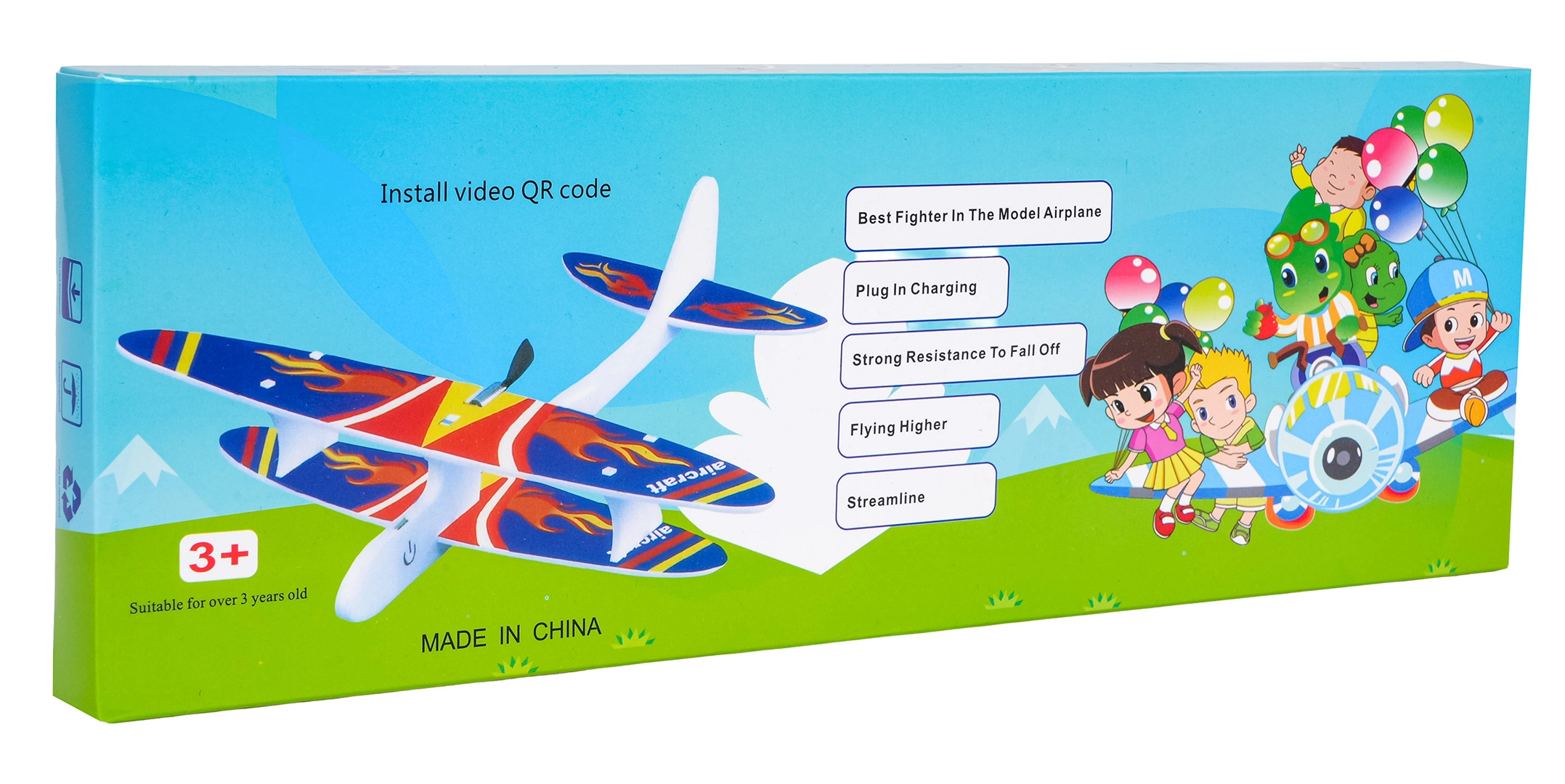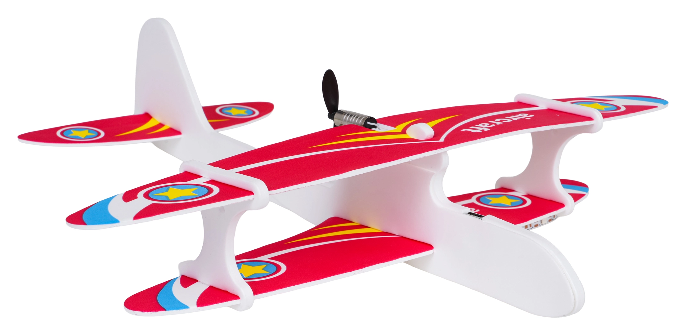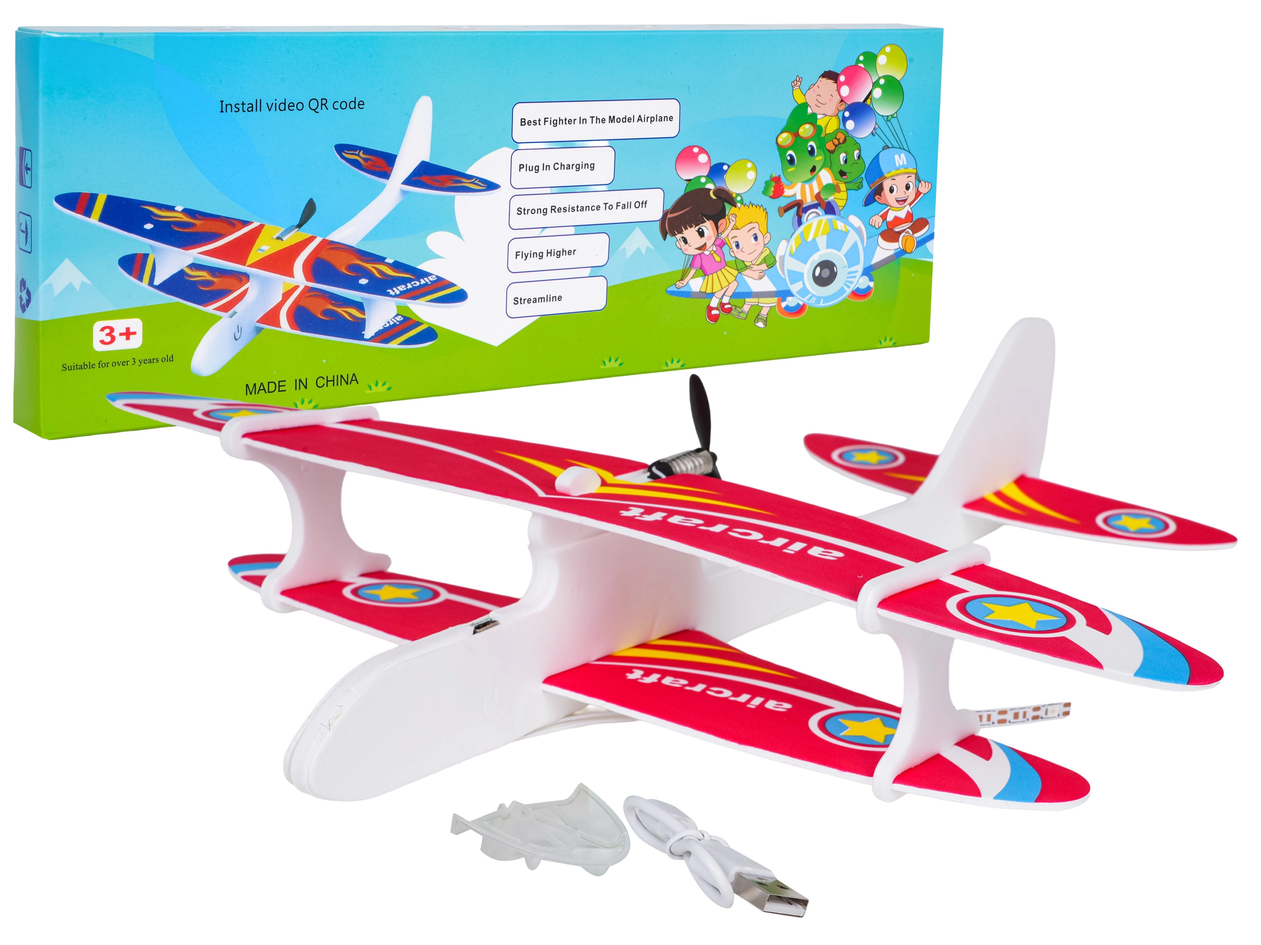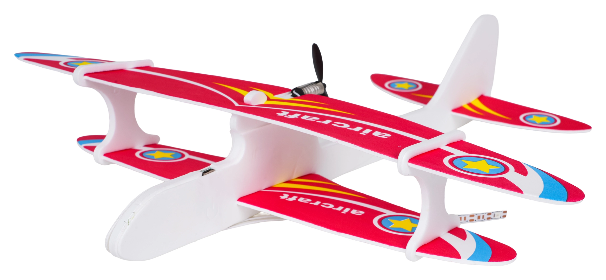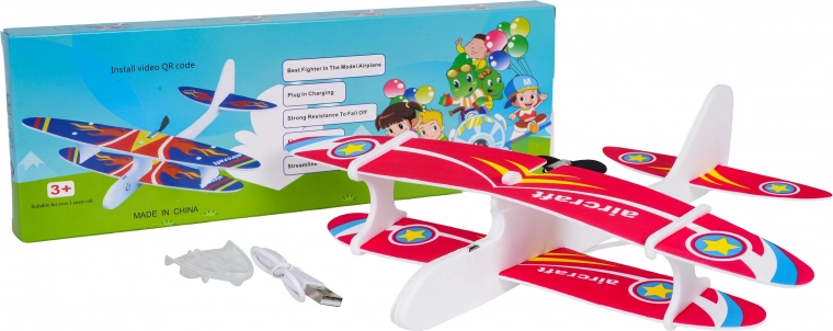 Zabavan i izdržljiv pjenasti zrakoplov s električnim motorom za djecu od 3 godine. Zahvaljujući laganoj konstrukciji i aerodinamičnom obliku leti stabilno u krugu, a nakon 15 sekundi motor se automatski isključuje i zrakoplov sigurno slijeće. Puni se preko USB-a, napaja ga 3,7 V akumulator i ima LED osvjetljenje za atraktivan let na otvorenom i u zatvorenom prostoru.