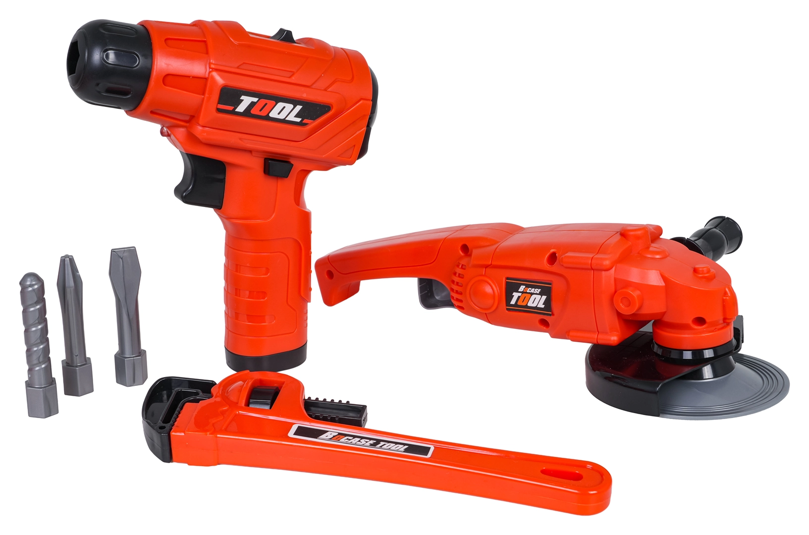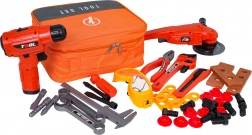torba, aku bušilica/odvijač, kutna brusilica, pomično mjerilo, podesivi ključ, viljuškasti i plosnati ključ, kliješta, nož, odvijač s nastavkom i bitovima, zaštitne naočale, 7× element za pričvršćivanje vijcima, 10× matica, 10× vijak