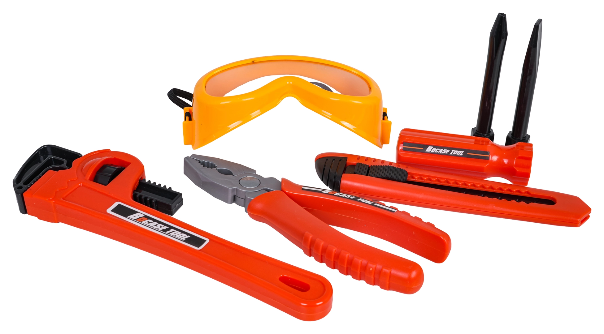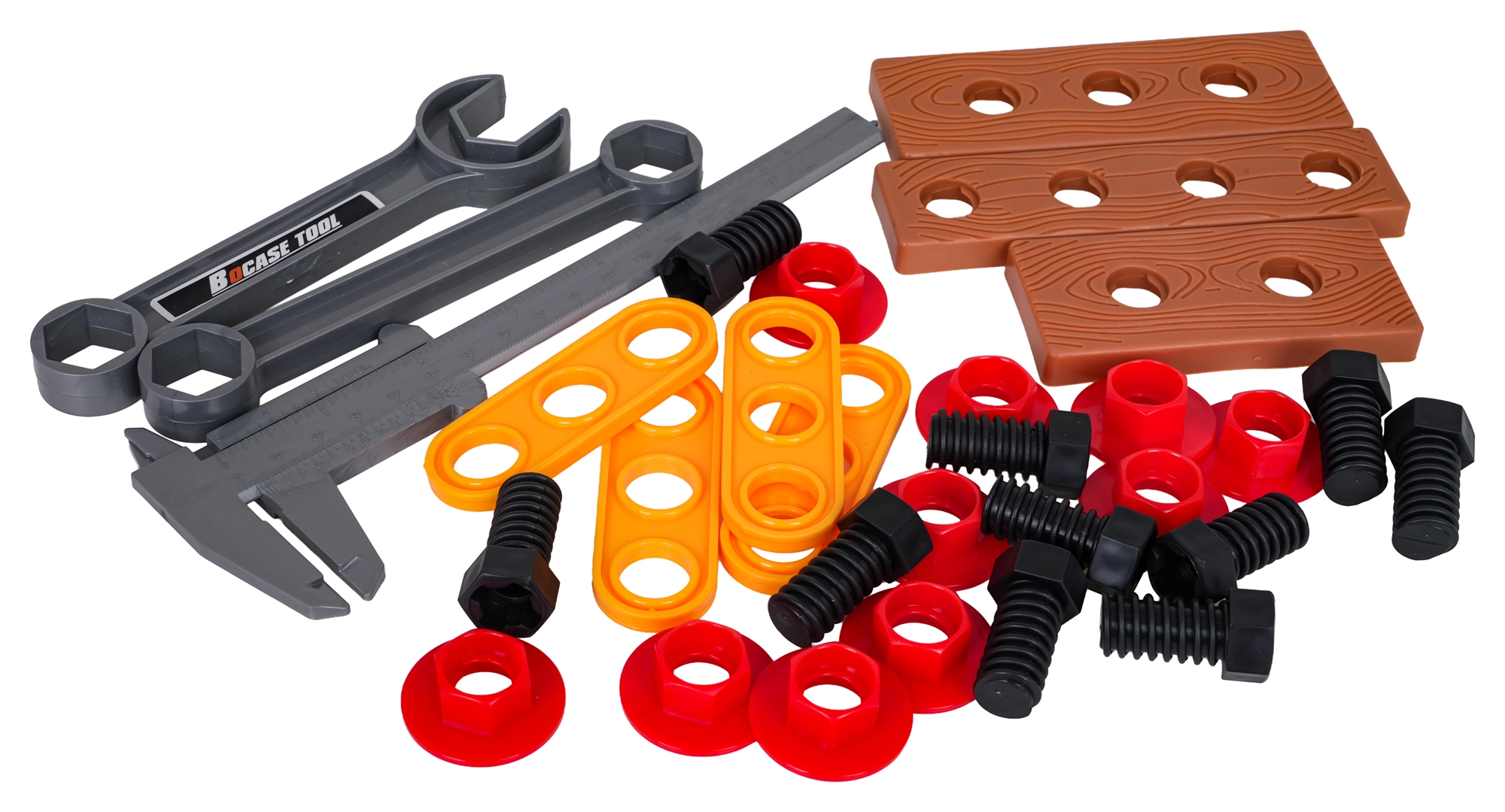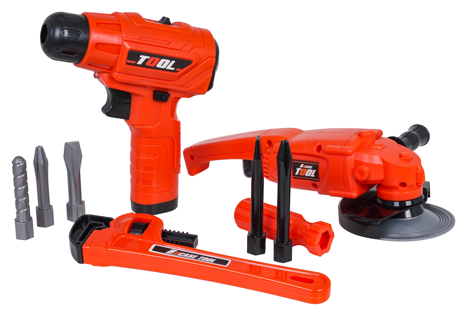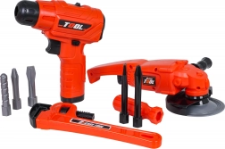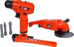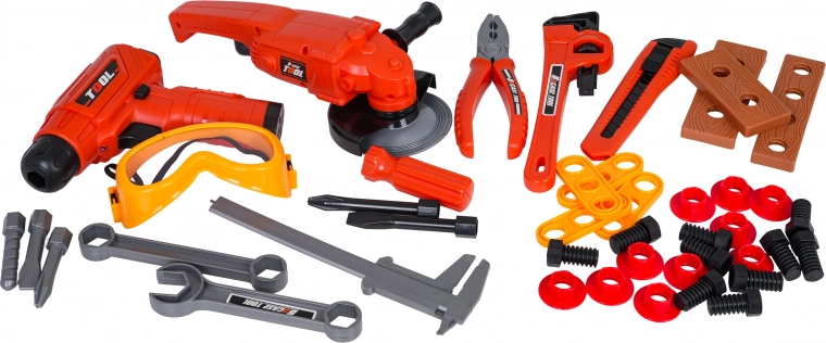 U kompletu je i kutna brusilica s ručno okretajućim diskom, setovi ključeva, kliješta, nož, odvijač s bitovima, šubler (pomično mjerilo) i zaštitne naočale. Djeca mogu vježbati finu motoriku, logiku i maštu spajajući dijelove pomoću vijaka i matica.