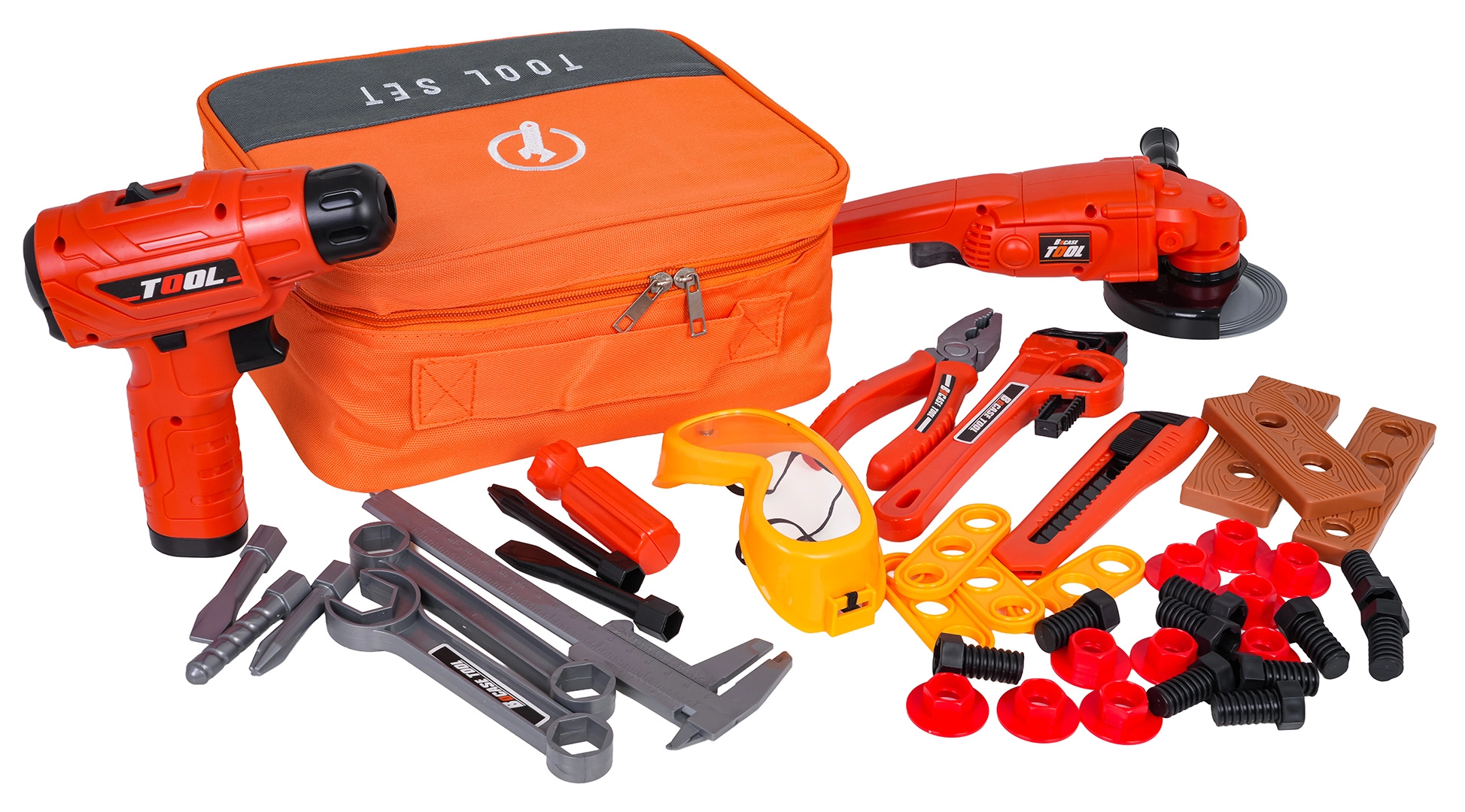 Bogato opremljen dječji set alata s praktičnom torbom nudi 42 dijela za kreativnu gradnju i učenje kroz igru. Sadrži akumulatorsku bušilicu/odvijač na baterije s svjetlosnim i zvučnim efektima, kutnu brusilicu s ručno okretajućim diskom, ključeve, kliješta, zaštitne naočale, vijke, matice i izmjenjive bitove. Izrađeno od kvalitetne, sigurne plastike za djecu od 3 godine naviše.