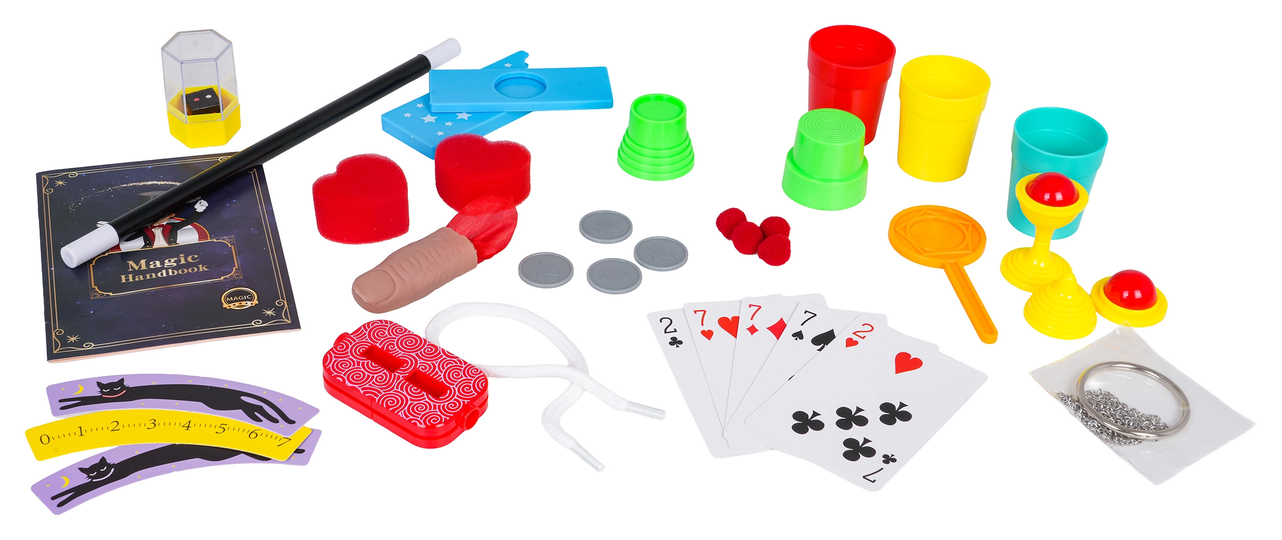 Štapić cca 24,5 cm; kutijica za novčiće cca 9,5 × 4 cm; novčići cca 2,3 cm; čašice za trikove cca 4,5 × 4 cm; kutijica s kockicama cca 5 × 3 cm; čarobni prst cca 5,5 × 3 cm; čaša s kuglicom cca 7 × 3 cm; čarobne čašice cca 3,5 × 4 cm