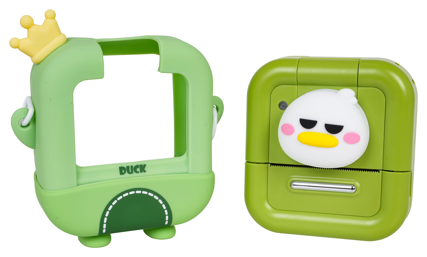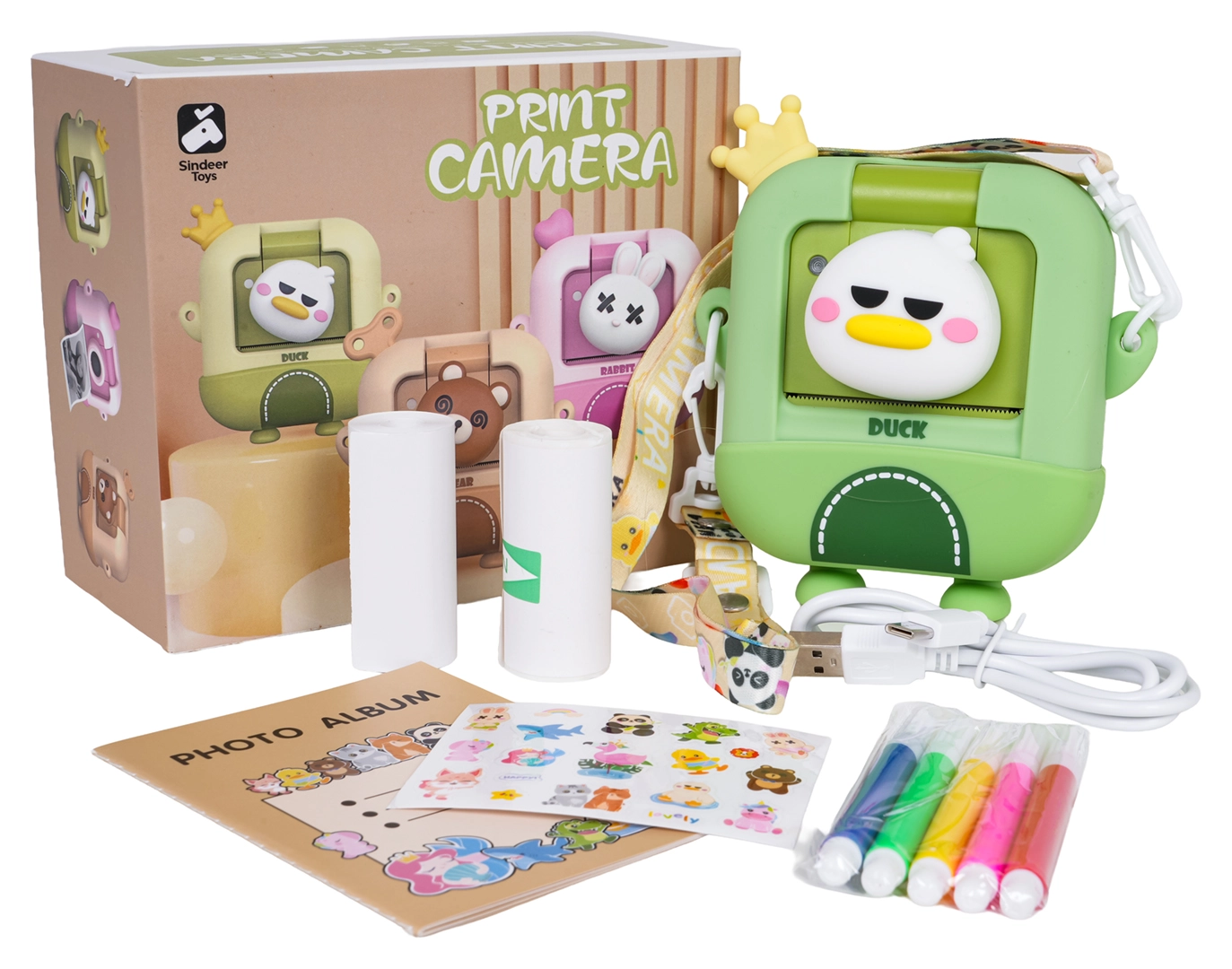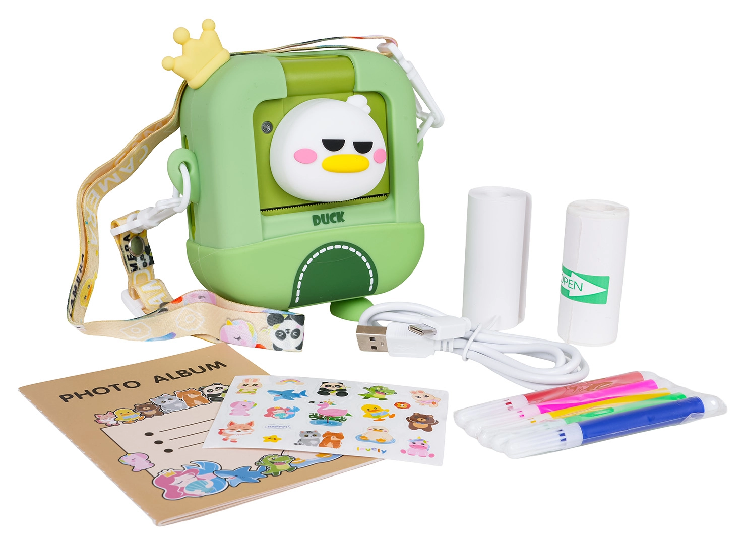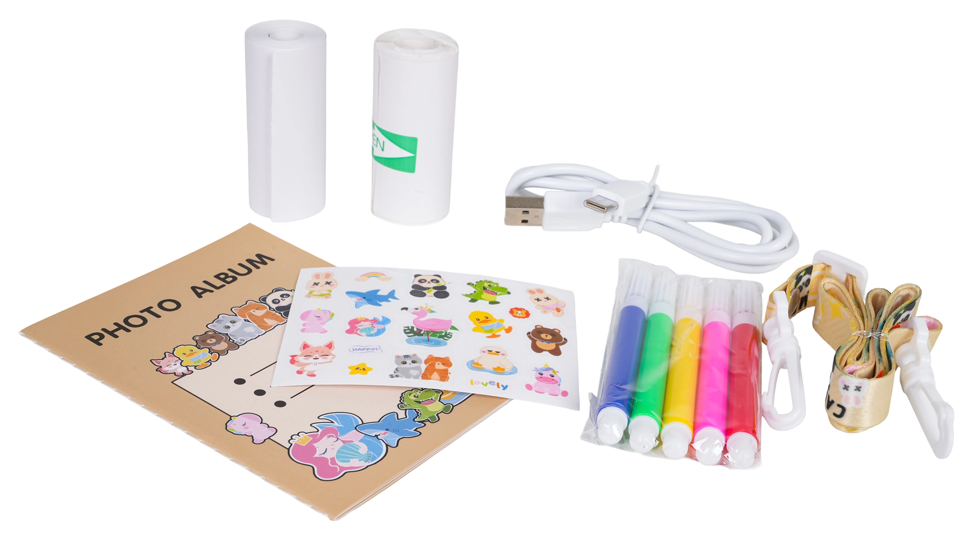 - Fotoaparat s motivom pačića, zaštitna futrola, 2× rola termopapira, uzica, USB kabel, fotoalbum, 5 flomastera, naljepnice, dekorativne samoljepljive naljepnice, upute