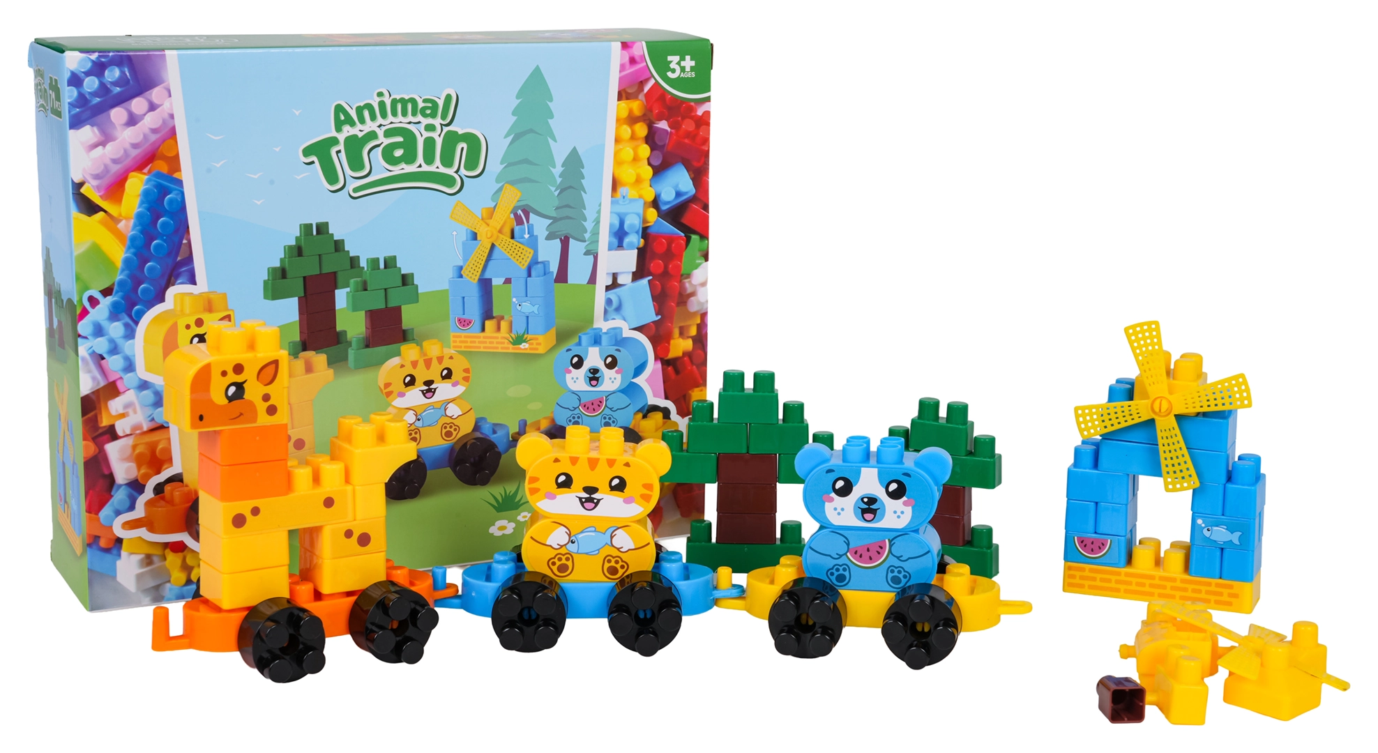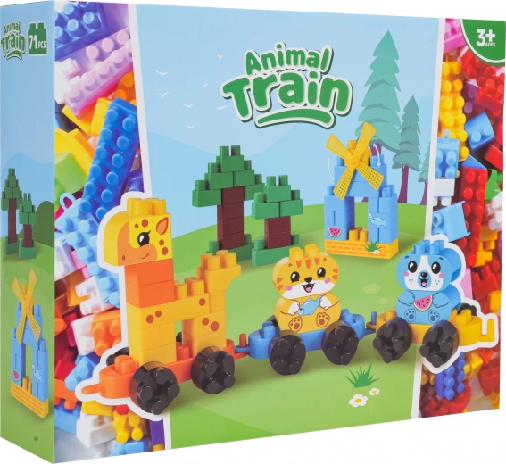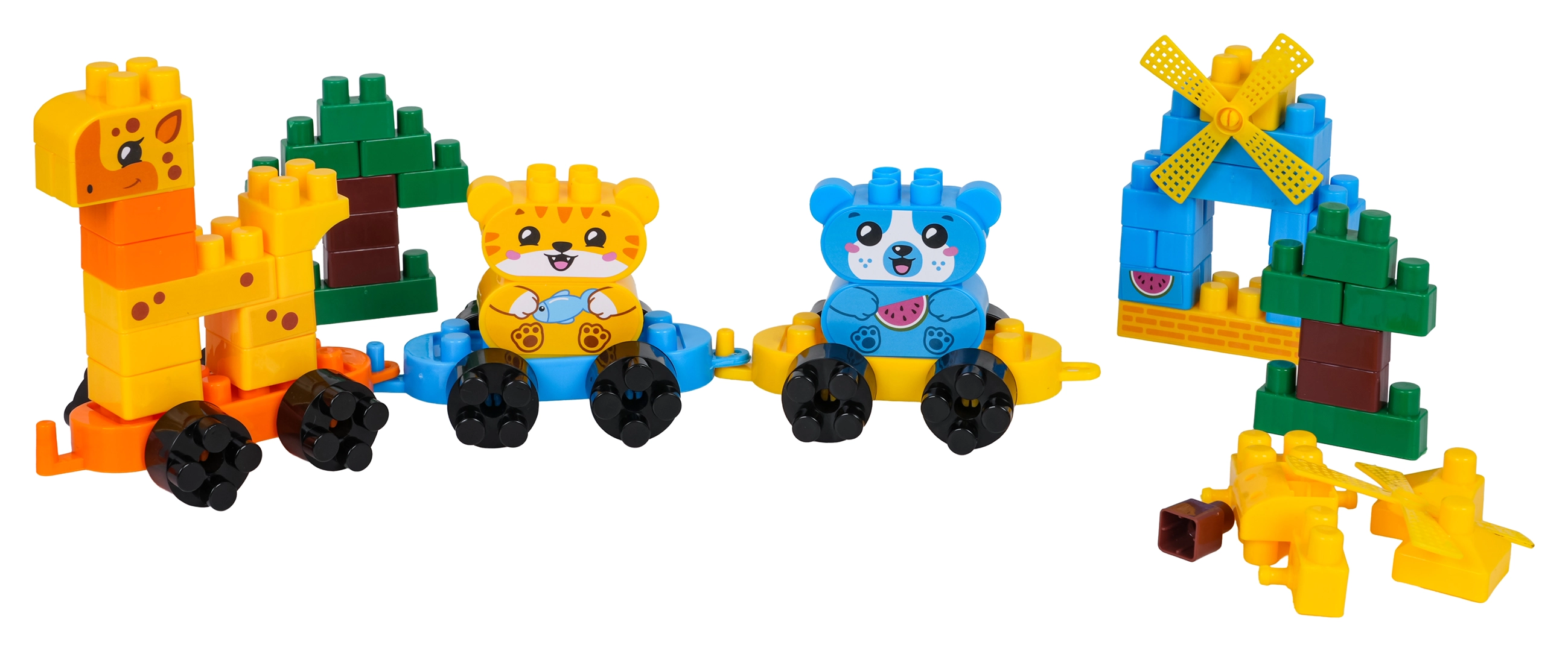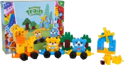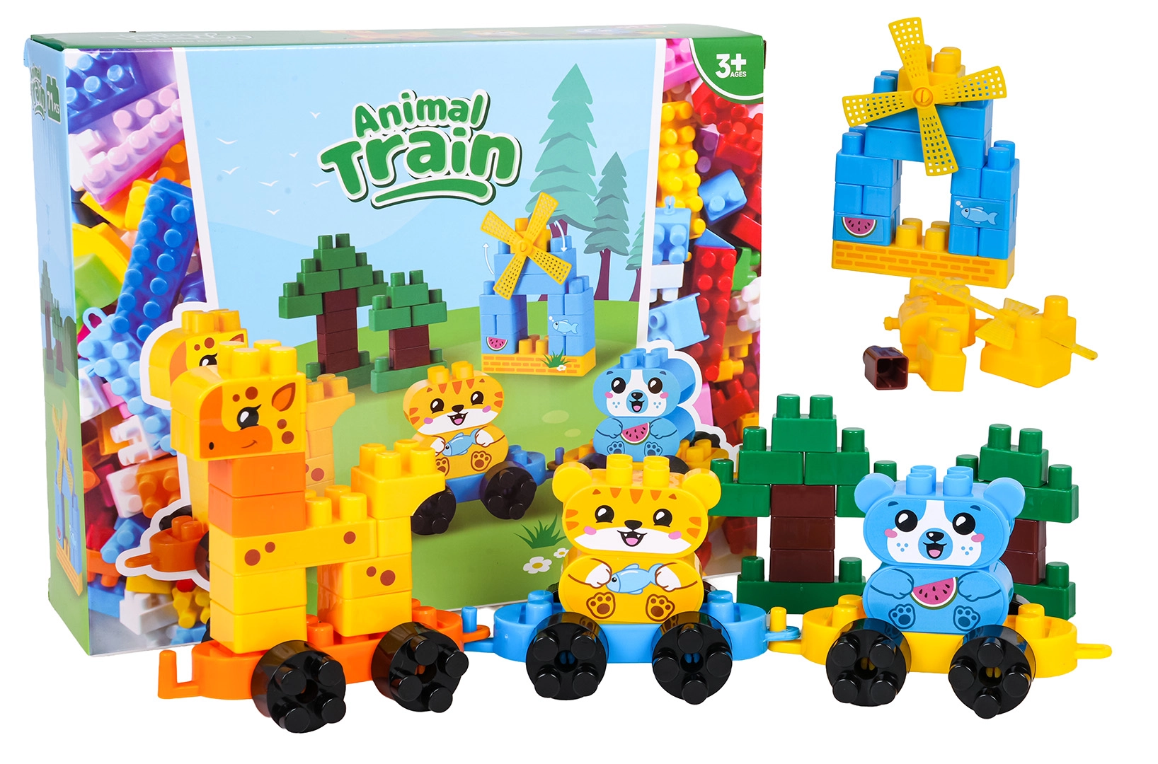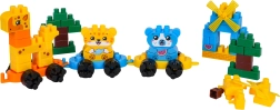 Otkrijte veliki set šarenih građevnih kocki od kojih djeca lako slažu preslatke životinjice na podvozjima, stabla i mali mlin. Spojite pojedine vagončiće i napravite potezni životinjski vlakić koji zahvaljujući kotačićima zaista vozi. Set je osmišljen za male graditelje od 3 godine – dijelovi su veći, ugodni za držanje i odlično se slažu.