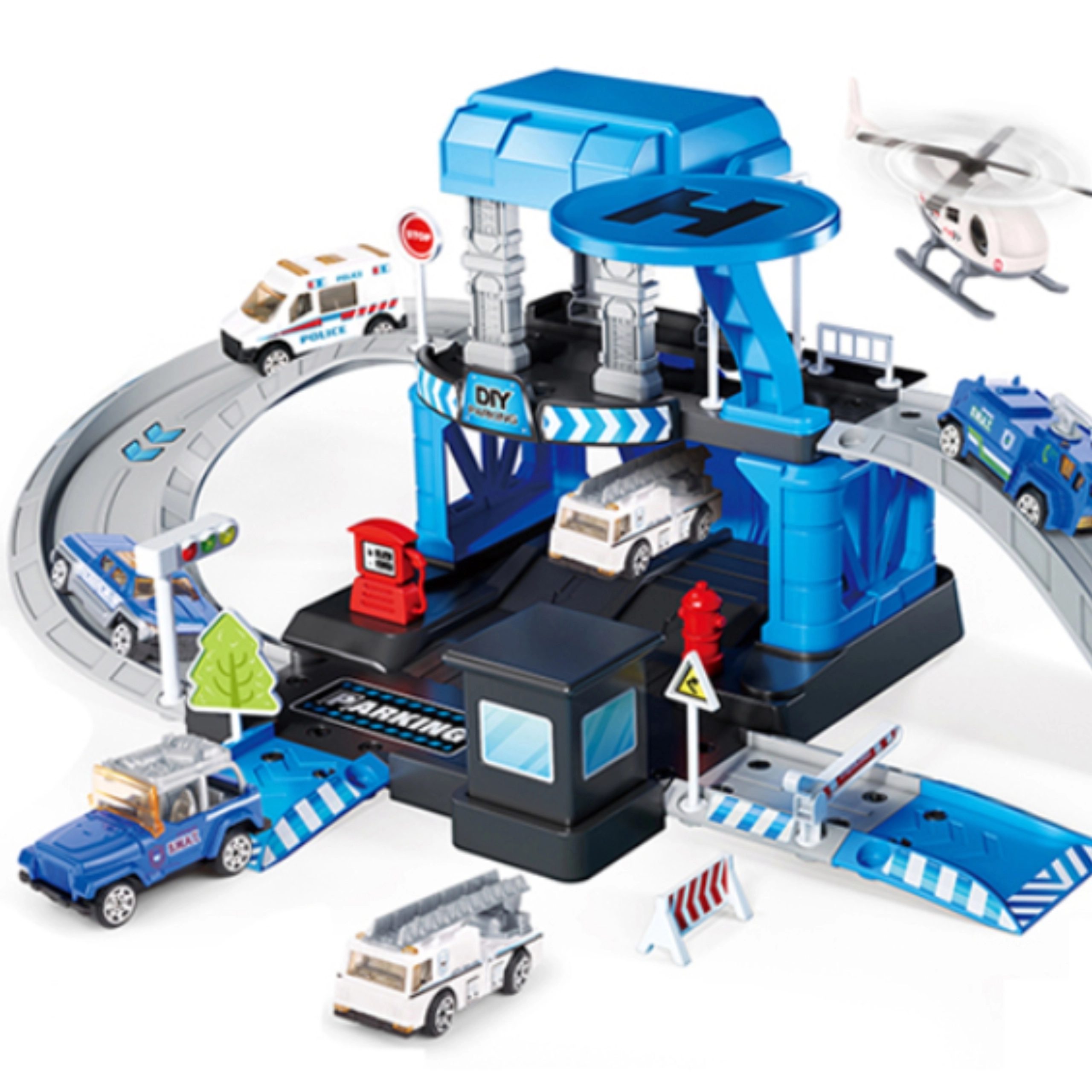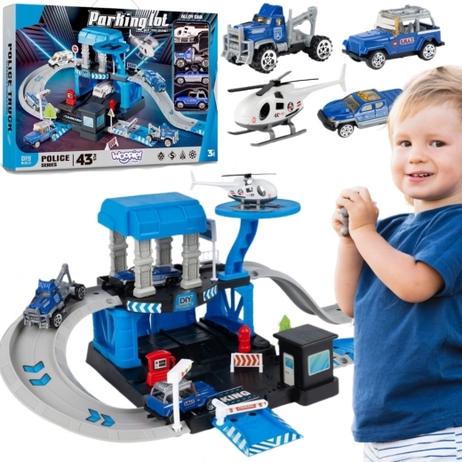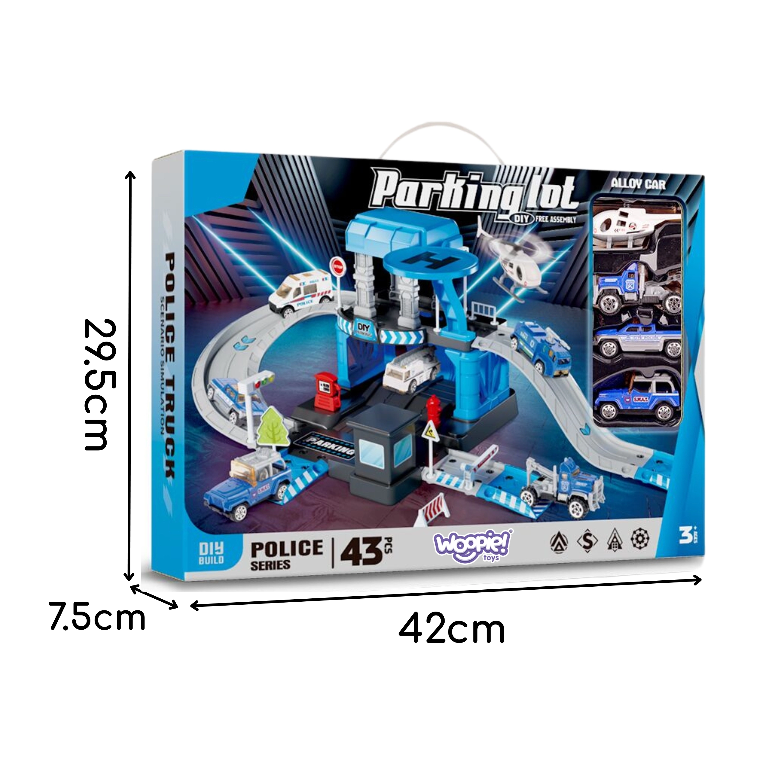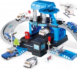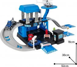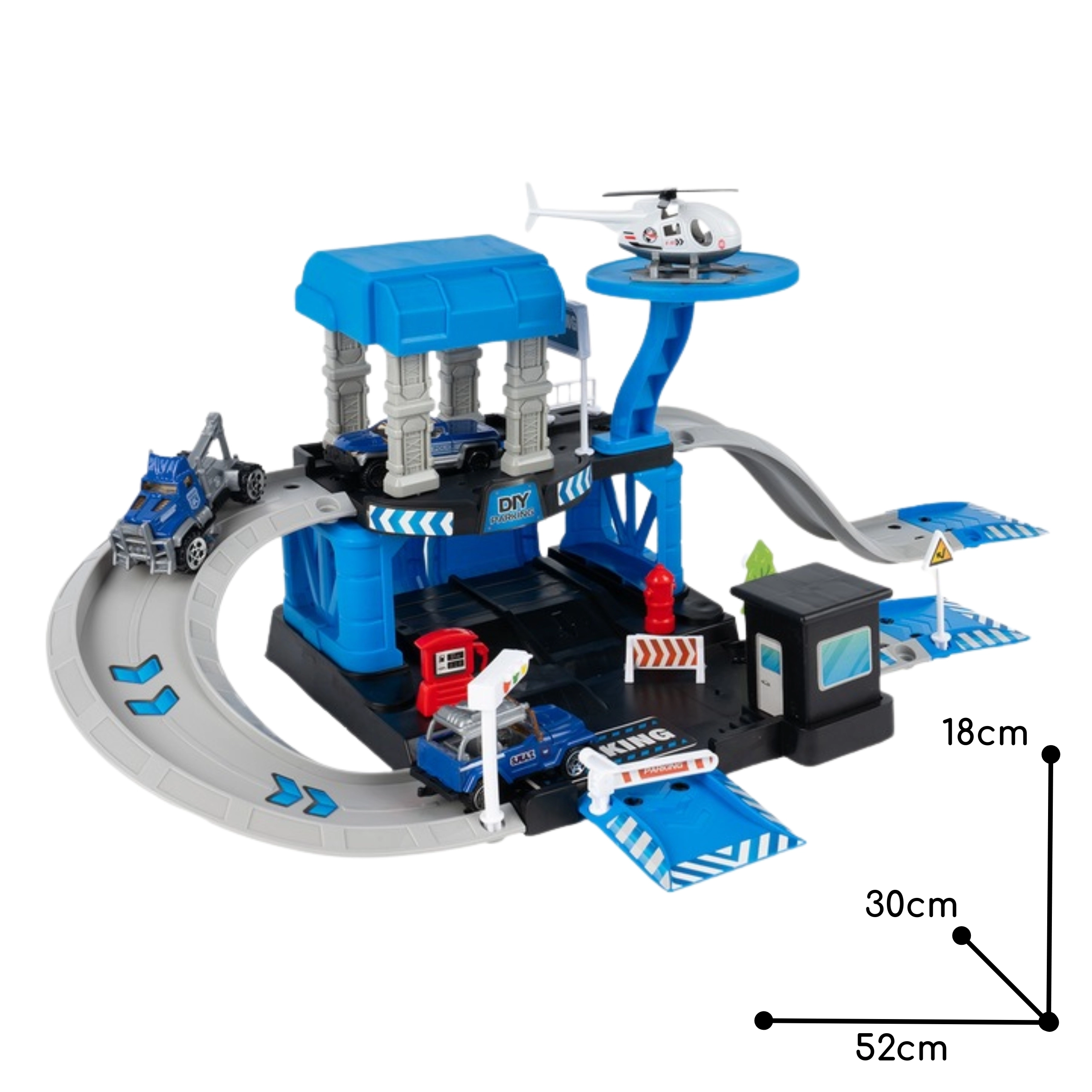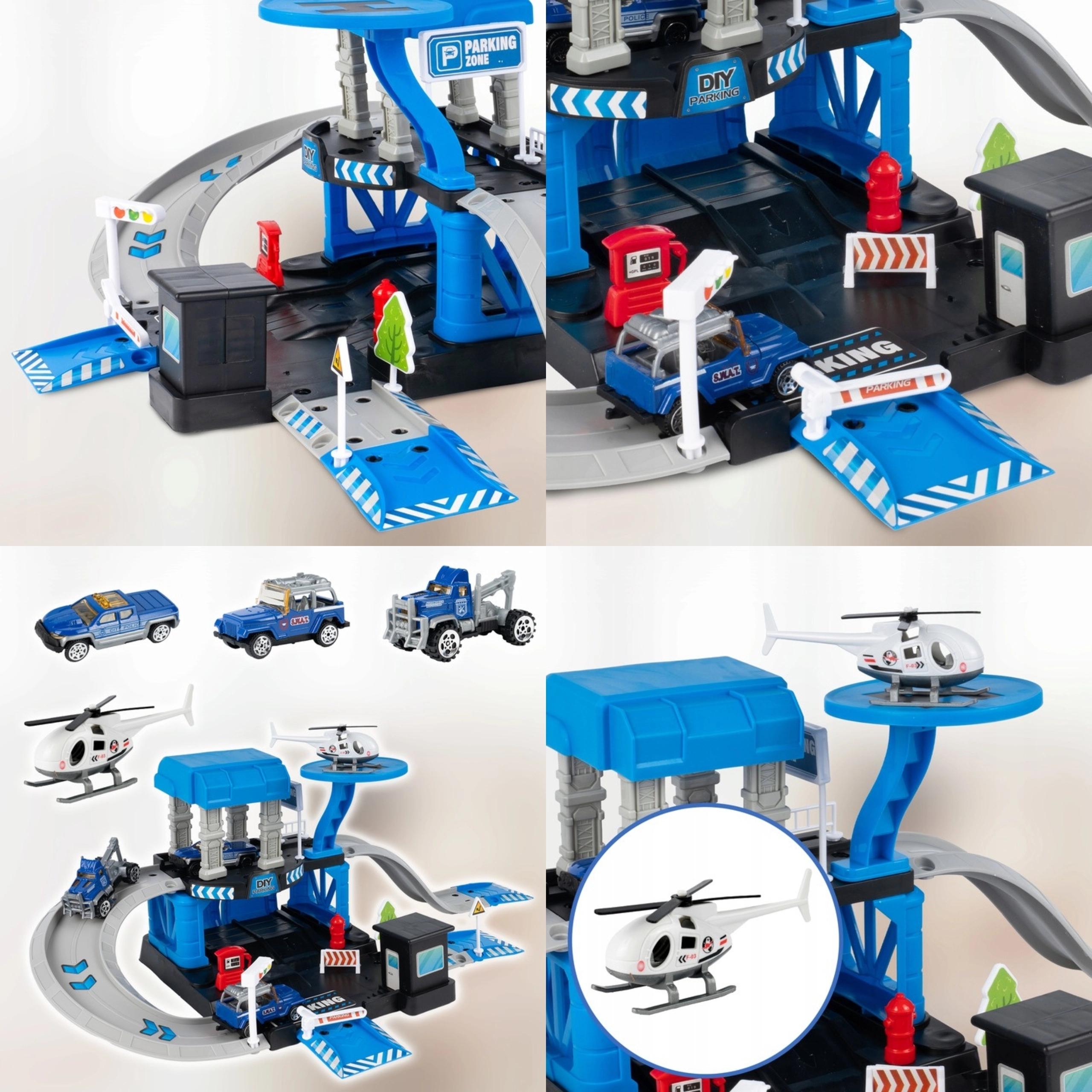 Stvorite vlastiti policijski grad! Ovaj dvoetažni parkirni kompleks s postajom donosi rampe, spuštališta i uzletište za helikopter. Zahvaljujući realističnim detaljima poput benzinske postaje, rampi, prometnih znakova, semafora i kućice čuvara, djeca lako osmišljavaju bezbroj priča i misija.