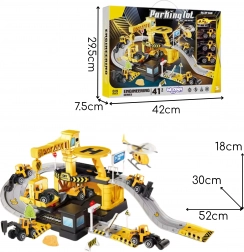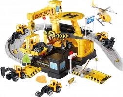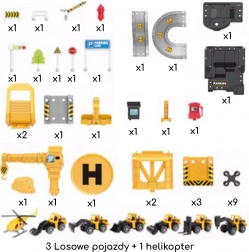 dvoetažno parkiralište s rampama i heliodromom, pribor (semafori, znakovi, ograde, rampe), 3 metalna građevinska autića (nasumični modeli), 1 helikopter