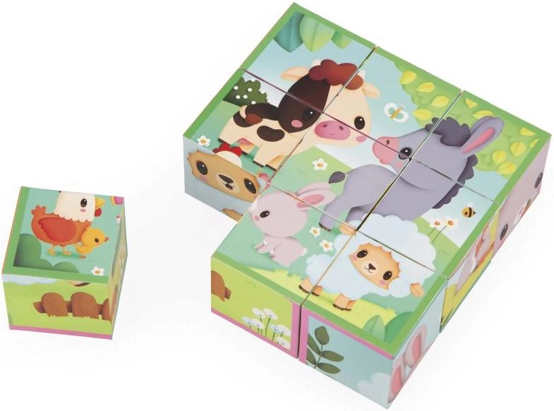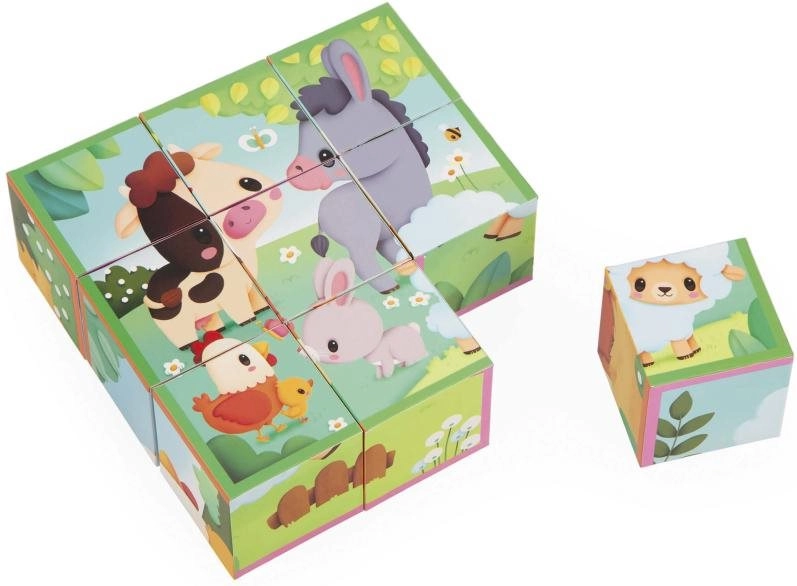 Ovaj klasični set slikovnih kocaka s motivima farme donosi djeci radost otkrivanja i učenja. Od 9 kvalitetnih drvenih kocaka lako se slaže 6 različitih slika sa životinjama. Djeca vježbaju slaganje, razvrstavanje i prostornu orijentaciju dok se igraju.