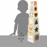 Ova drvena piramida od 6 kocaka oduševit će nježnim bojama i pažljivim ilustracijama. Djeca mogu kocake slagati, razvrstavati i ubacivati, čime bolje razumiju principe ravnoteže, veličina i prostora. Svaka kocaka ima 5 različitih strana: simpatičnu životinju, životinju u okruženju, malu životinju na obojenoj pozadini, brojku za prve izračune i izrezani oblik koji spajanjem dviju kocaka otkriva veselu sličicu (npr. mačkicu u srcu).