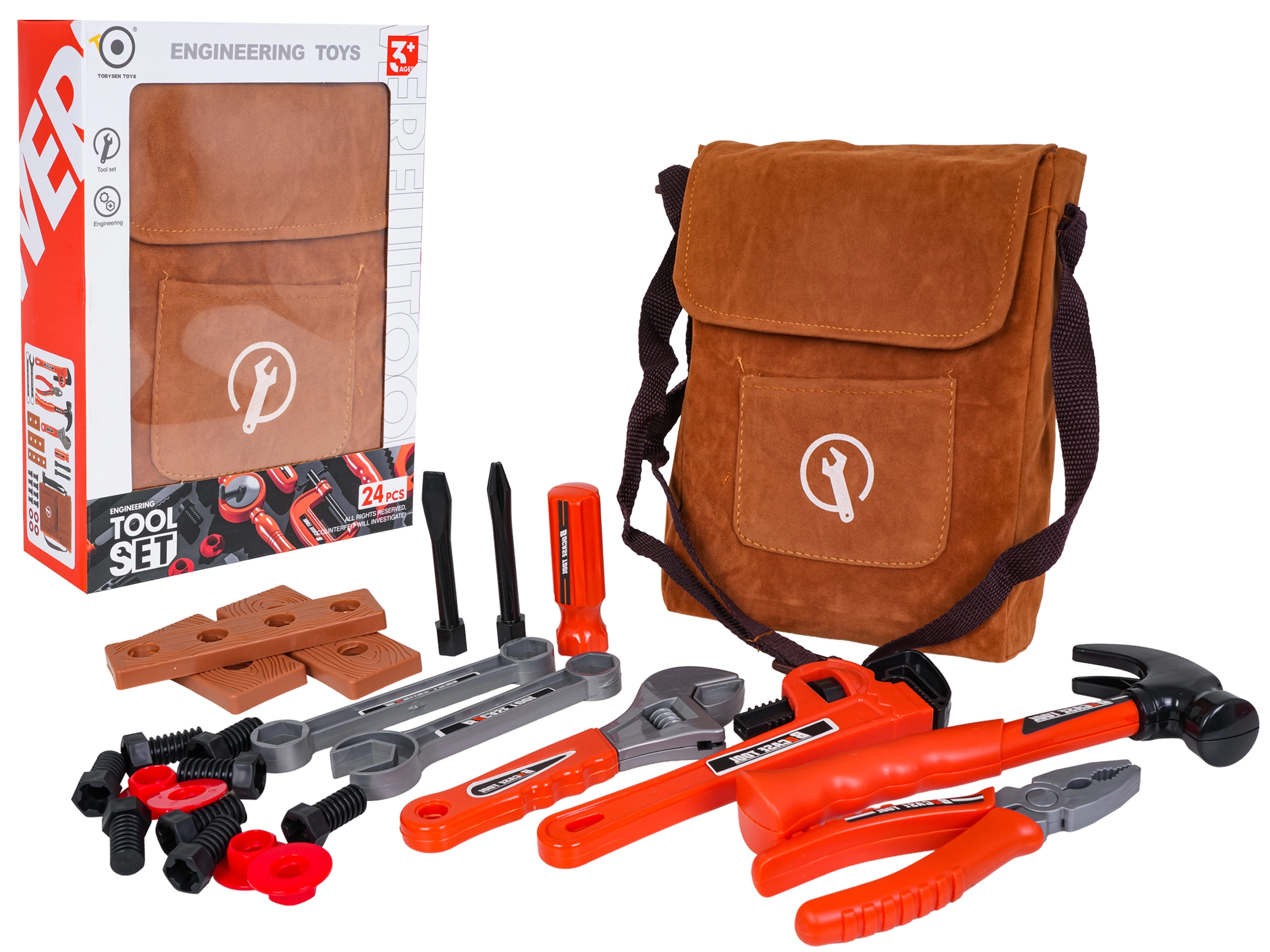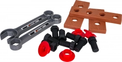 U pakiranju je sve potrebno: čekić, kliješta, papagajke, podesivi ključ, odvijač s izmjenjivim bitovima, vijci, matice i “drvene” letvice s rupama za vježbanje. Dijelovi su oblikovani za male dječje ruke s naglaskom na udobno držanje i sigurnu uporabu.