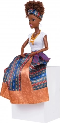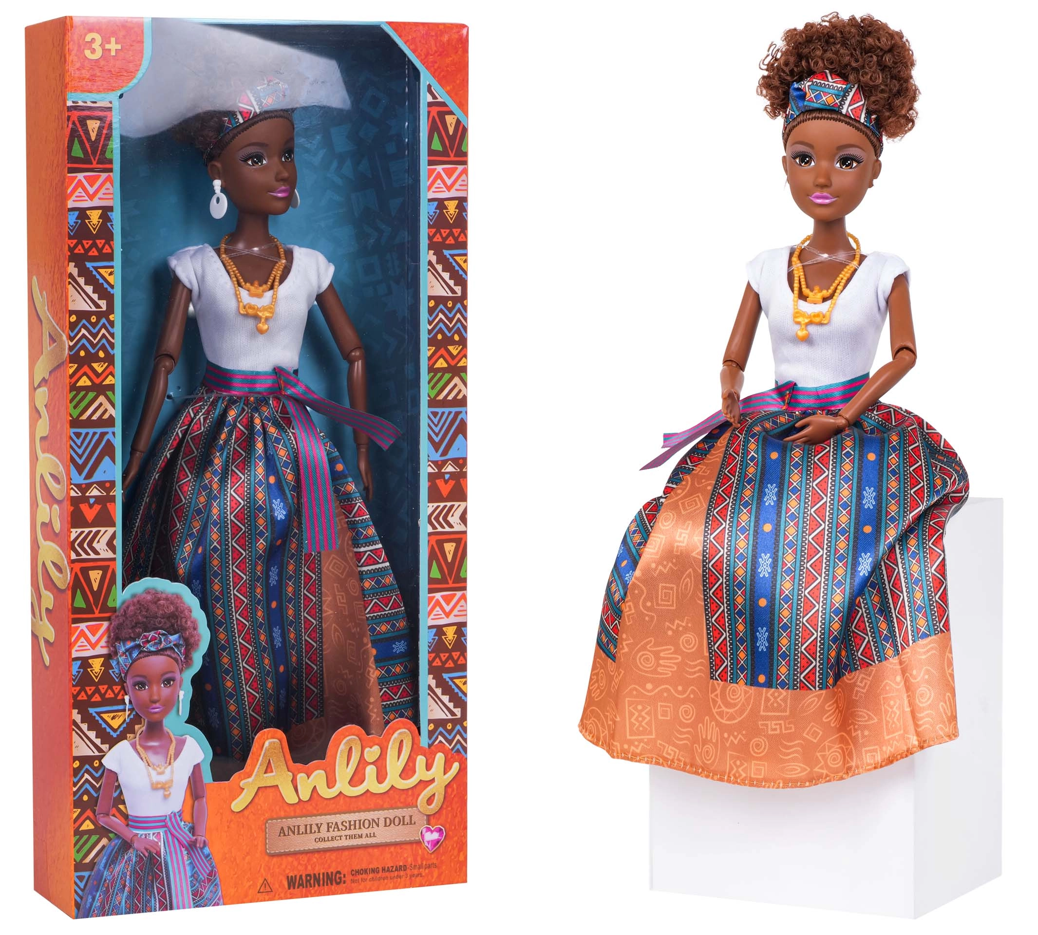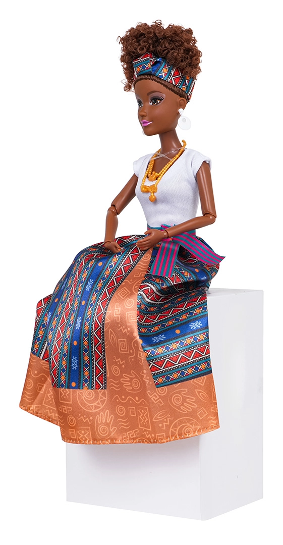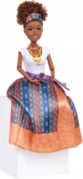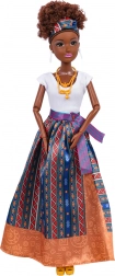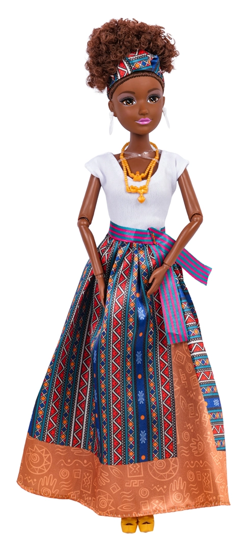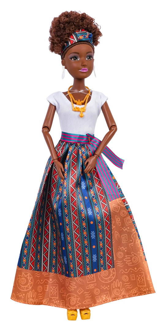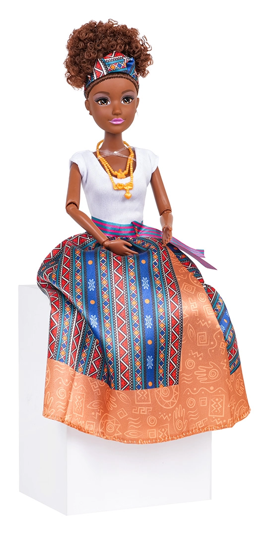 Bijeli top, duga šarena suknja, usklađena traka za kosu i nakit daju lutki izražajan izgled koji djeca obožavaju.