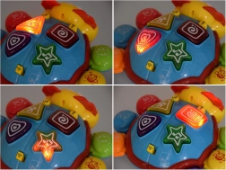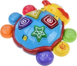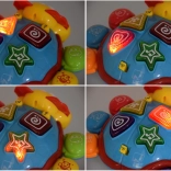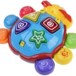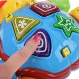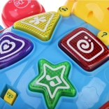 Pritiskom šarenih tipki djeca upoznaju boje i životinje; kviz-tipka s upitnikom poziva na jednostavne zadatke.