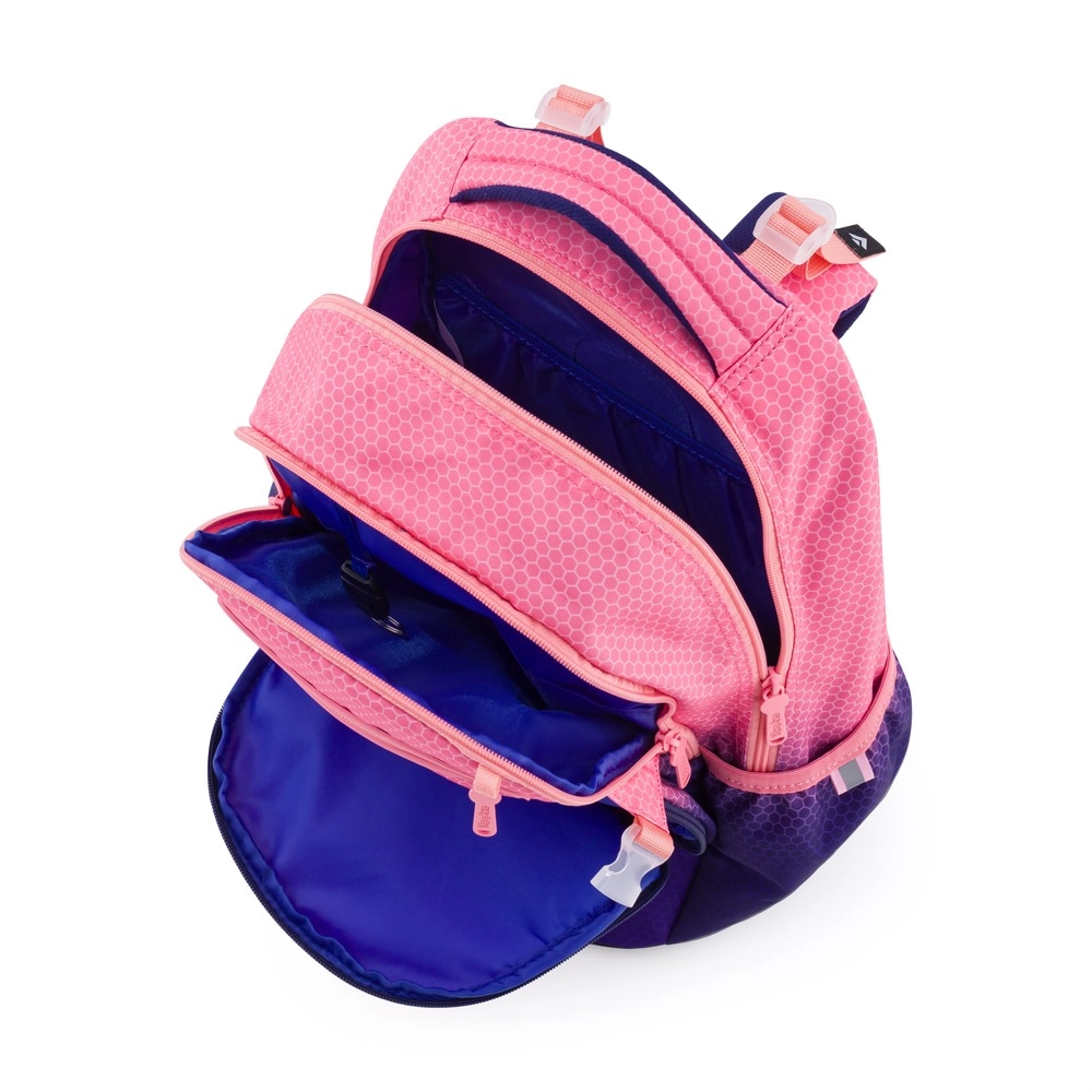 Dva velika pretinca stanuju udžbenike, bilježnice i pernicu, dok je prednji džep idealan za manji obrok ili ključeve. Bočni elastični džepovi udobno primaju bocu za piće. Čvrsto dno sprječava prevrtanje i omogućuje da torba samostalno stoji. Tu su i reflektirajući elementi za bolju vidljivost u sumrak i mraku.