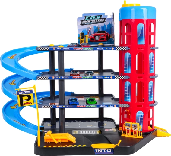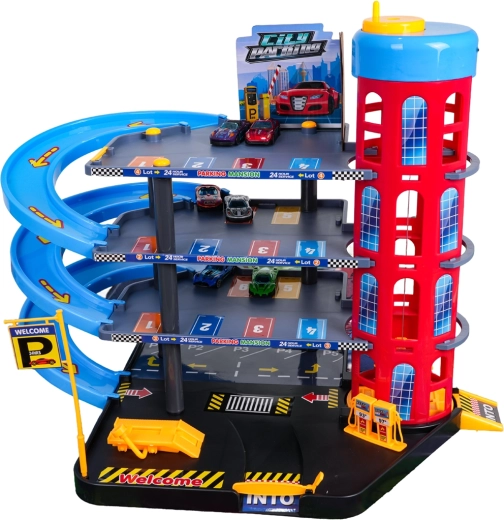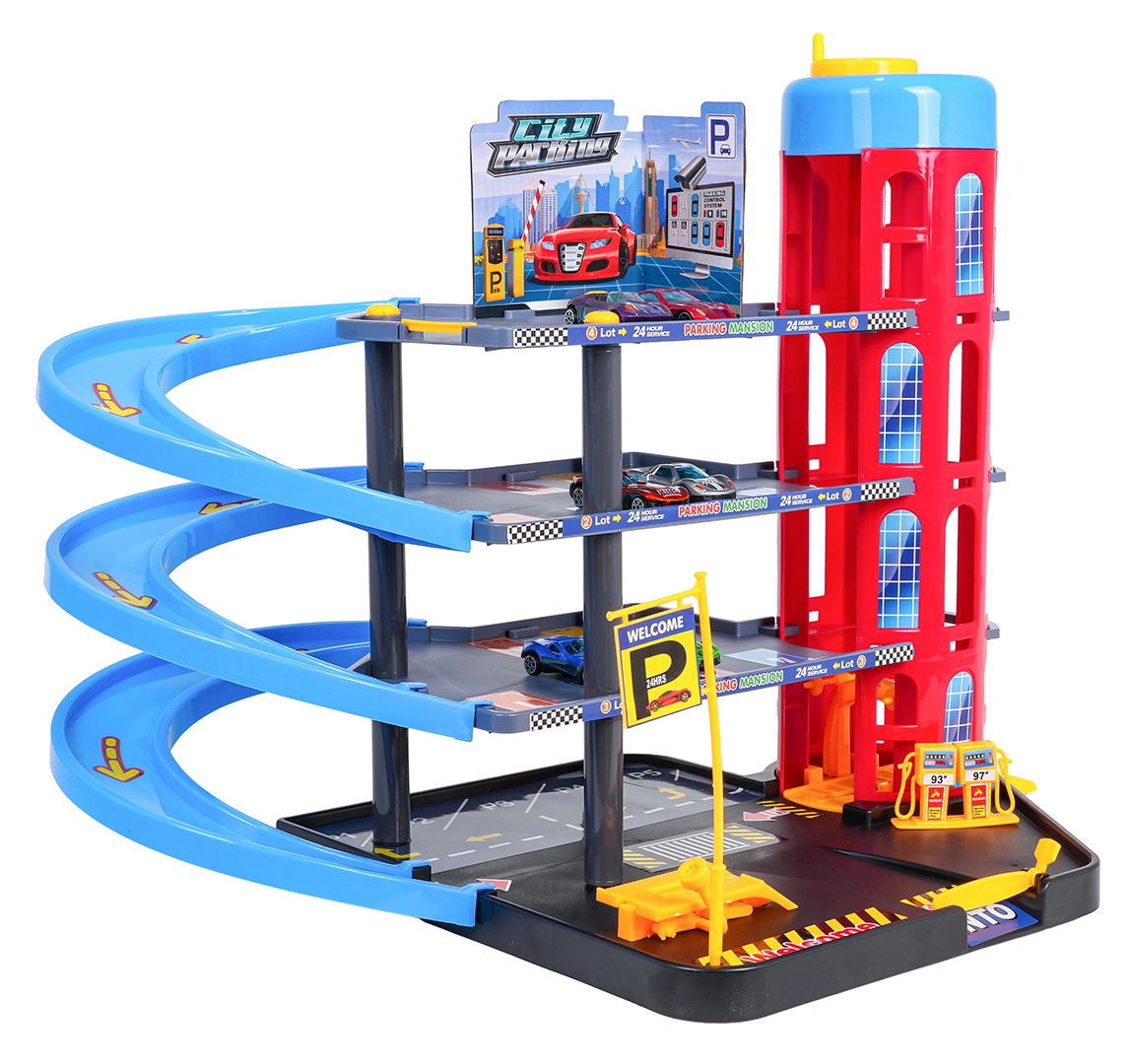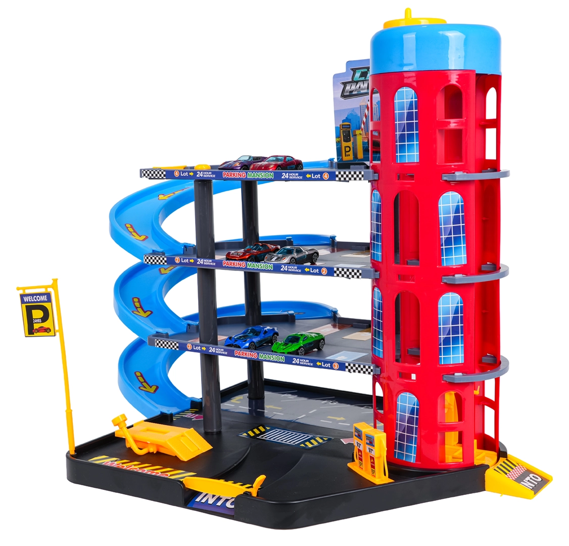 Ovo šareno višekatno parkiralište spaja realistične gradske elemente s dinamičnom vožnjom. Djeca mogu dizati autiće ručno upravljanim liftom, parkirati na pojedinim katovima i spuštati ih niz spiralne rampe. Integrirana benzinska postaja, servisna dizalica i ulaz s rampom potiču maštovitu igru.