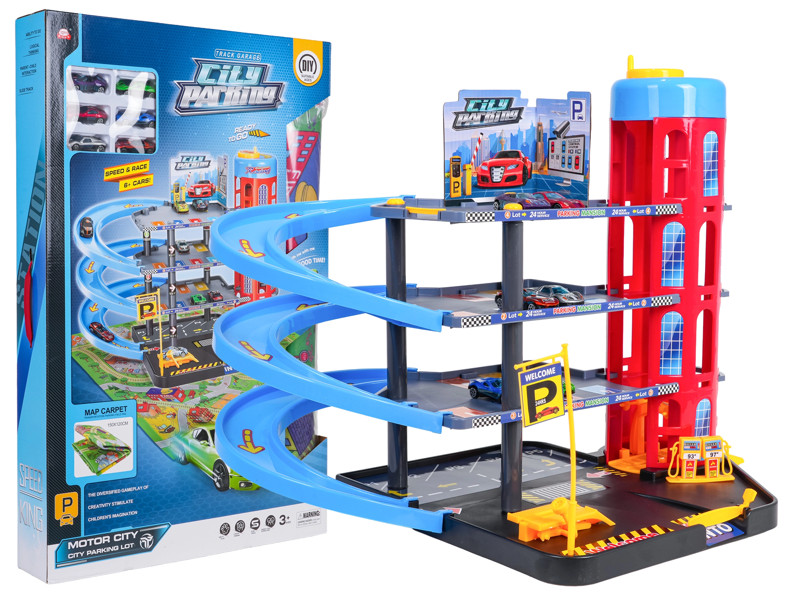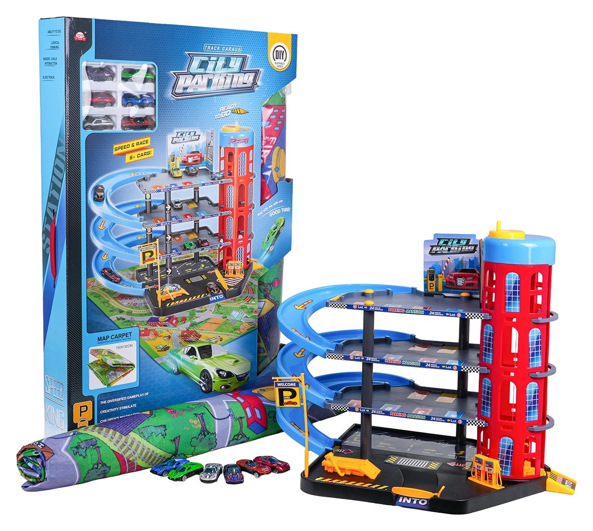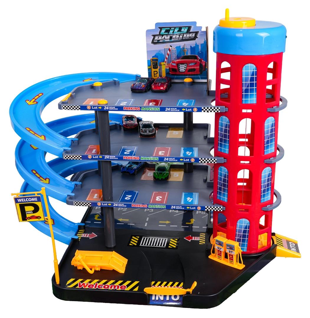 Ovo šareno višekatno parkiralište spaja realistične gradske elemente s dinamičnom vožnjom. Djeca mogu dizati autiće ručno upravljanim liftom, parkirati na pojedinim katovima i spuštati ih niz spiralne rampe. Integrirana benzinska postaja, servisna dizalica i ulaz s rampom potiču maštovitu igru.