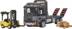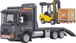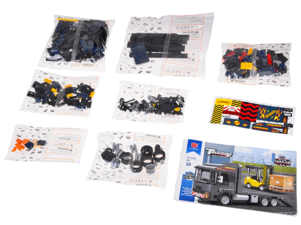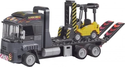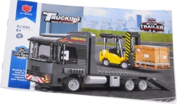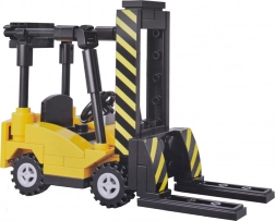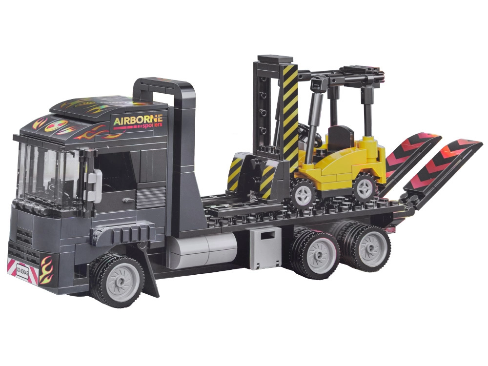 Ova tehnička građevinska igračka donosi u dječju sobu svijet prijevoza i logistike. Sastavite tegljač s platformom i sklopivim rampama, ukrcajte viličar na platformu i krenite “na put”. Realistična paleta boja u nijansama tamnoplave, sive i žute te priložene naljepnice daju modelima autentičan izgled radnih strojeva.