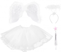 Pretvorite svoje dijete u preslatkog anđelčića s ovim kompletnim kostimom. Set sadrži bijela pernata krila, mekanu aureolu na obruču za glavu, pufastu tutu suknju s elastičnim pojasom i zvjezdasti čarobni štapić. Lagano, udobno i idealno za priredbe, nastupe, karneval, fotografiranja i igru kod kuće.