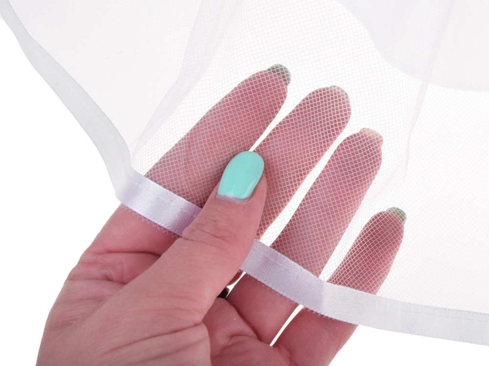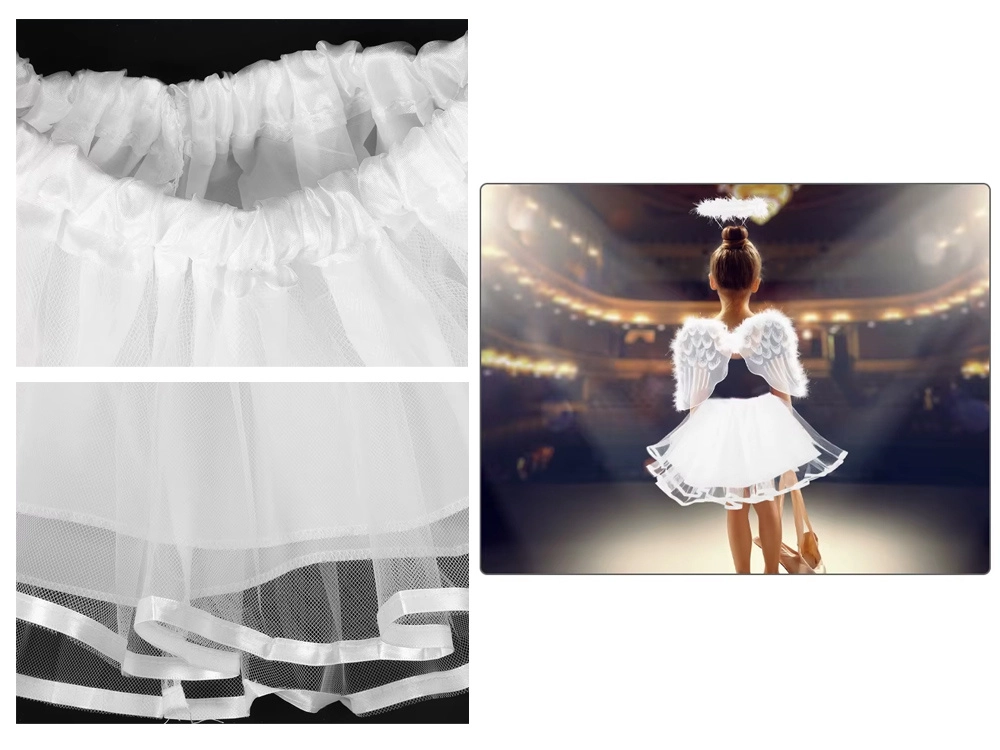 Višeslojna til suknja je lagana i prozračna. Elastični pojas lako se prilagođava – približno 18–30 cm u opsegu, duljina suknje oko 32 cm. Savršena za slobodno kretanje i cjelodnevnu udobnost.