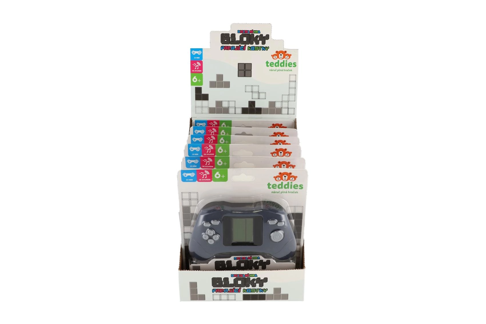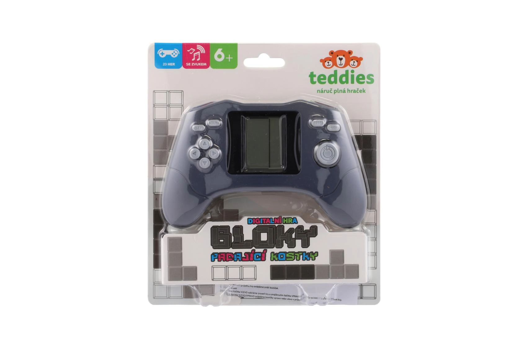 Ova džepna digitalna konzola u retro gamepad stilu nudi sjajnu dozu zabave kad god poželite. Monokromatski LCD zaslon prikazuje omiljene blokovske igre, logičke zagonetke i brze refleksne izazove. Ergonomsko kućište savršeno leži u ruci, a upravljanje je jednostavno pomoću smjernih strelica i funkcijskih tipki.