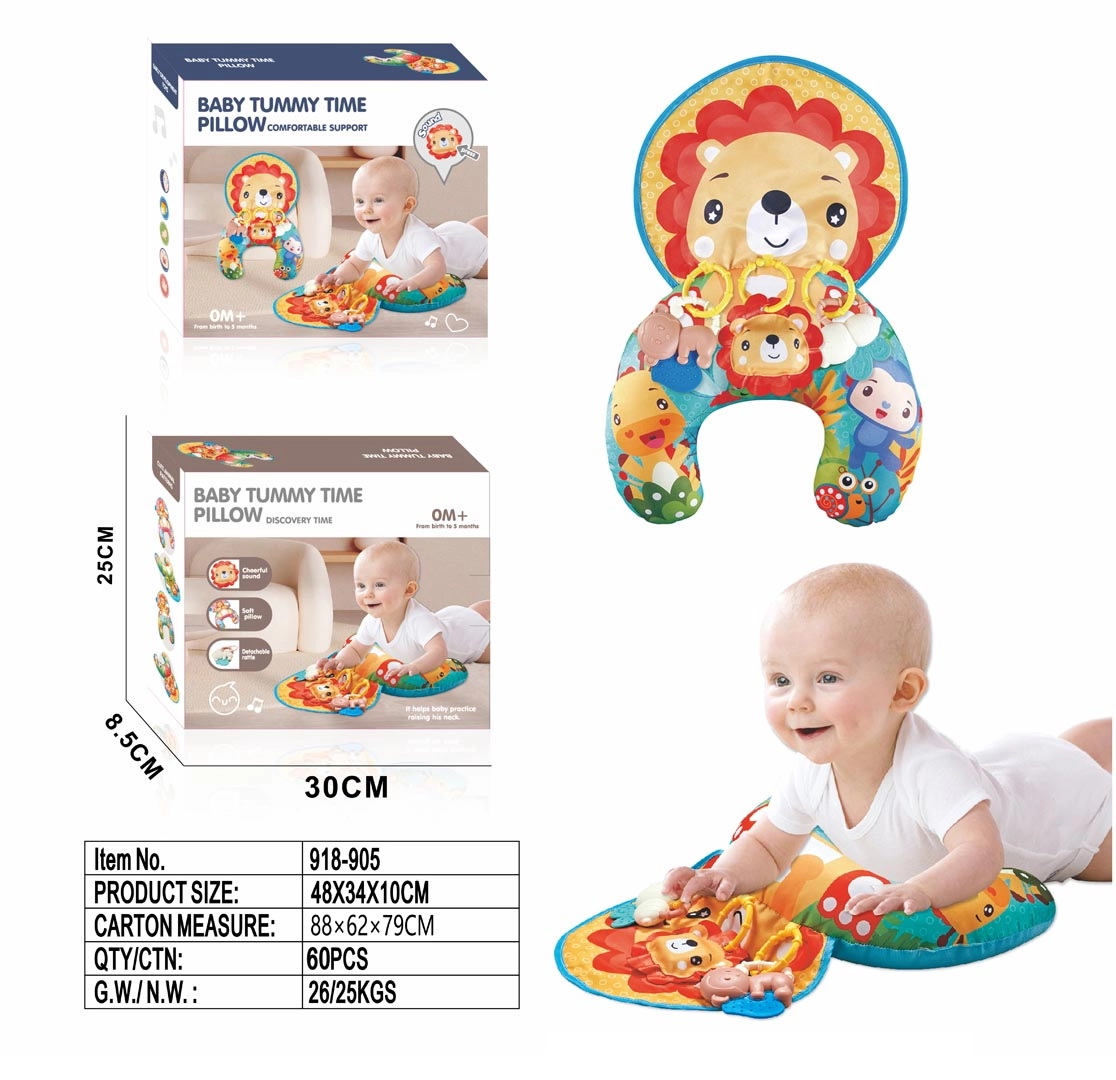 U kompletu su tri odvojive igračke koje se mogu pričvrstiti i na krevetić ili kolica. Viseća igračka s medvjedićem i gljivicom ima grickalicu i zvečku, a viseća igračka s lavom sadrži piskalicu. Zahvaljujući prilagodljivosti i mekoj ispuni, jastuk je idealan suputnik za igru, odmor i putovanja.