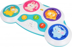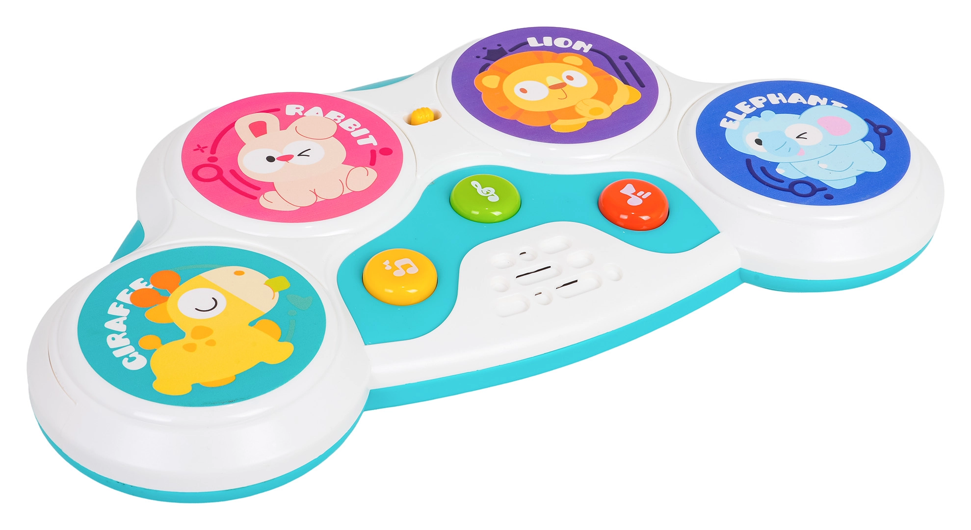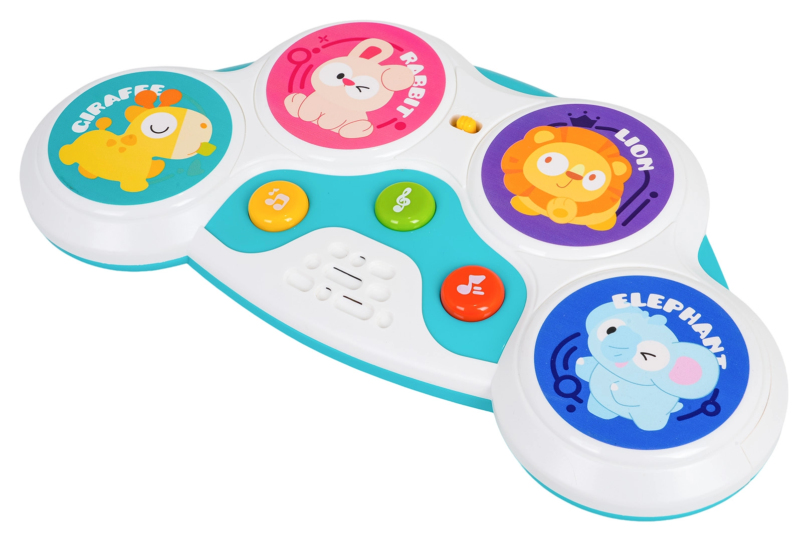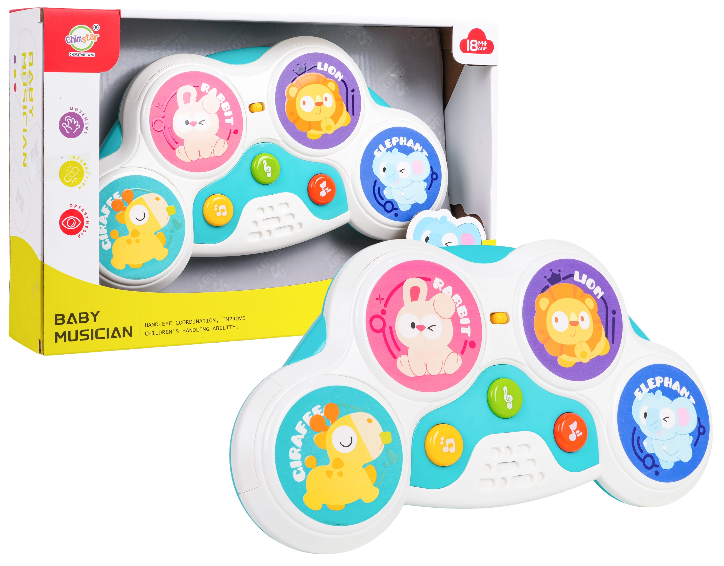 Četiri obojene plohe s motivima zeca, lava, žirafe i slona pokreću životinjske zvukove, melodije i bubnjarske ritmove – zabava na jedan dodir.