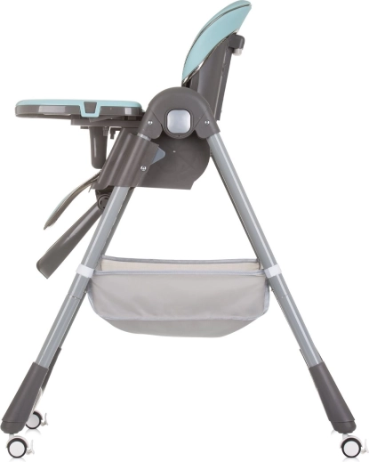 Podesiva dječja hranilica First Spoon teal: 4× nagib, 7× visina, dvostruka ploha, petotočkovni pojasevi, kotačića i košara. Lako čišćenje, kompaktno sklapanje.