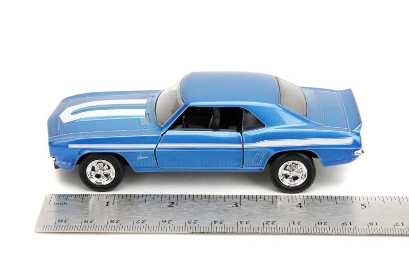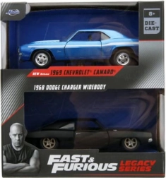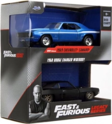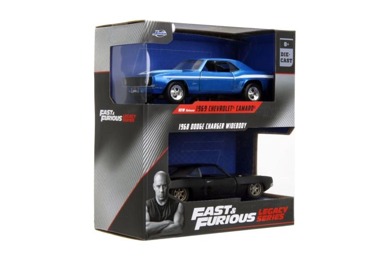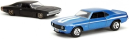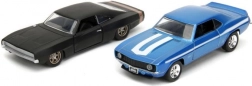 Ovo stilsko dvostruko pakiranje donosi dva klasična muscle cara u kolekcionarskoj kvaliteti: plavi Chevrolet Camaro 1969 s bijelim prugama i mat crni Dodge Charger Wide Body 1968. Realne proporcije, čiste linije karoserije i prozirna stakla dočaravaju filmsku atmosferu serijala Brzi i žestoki.