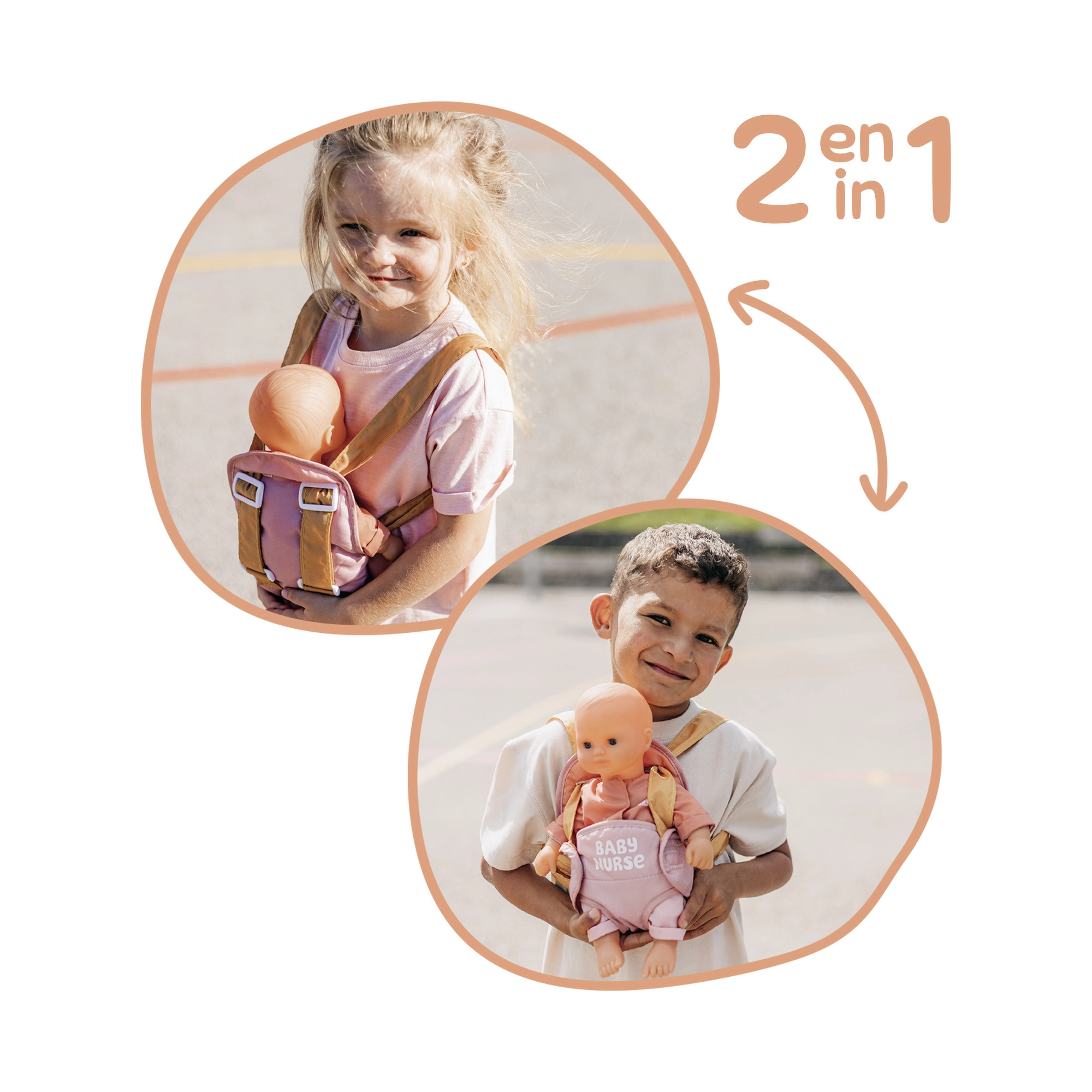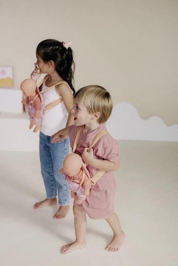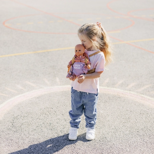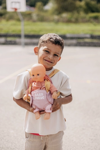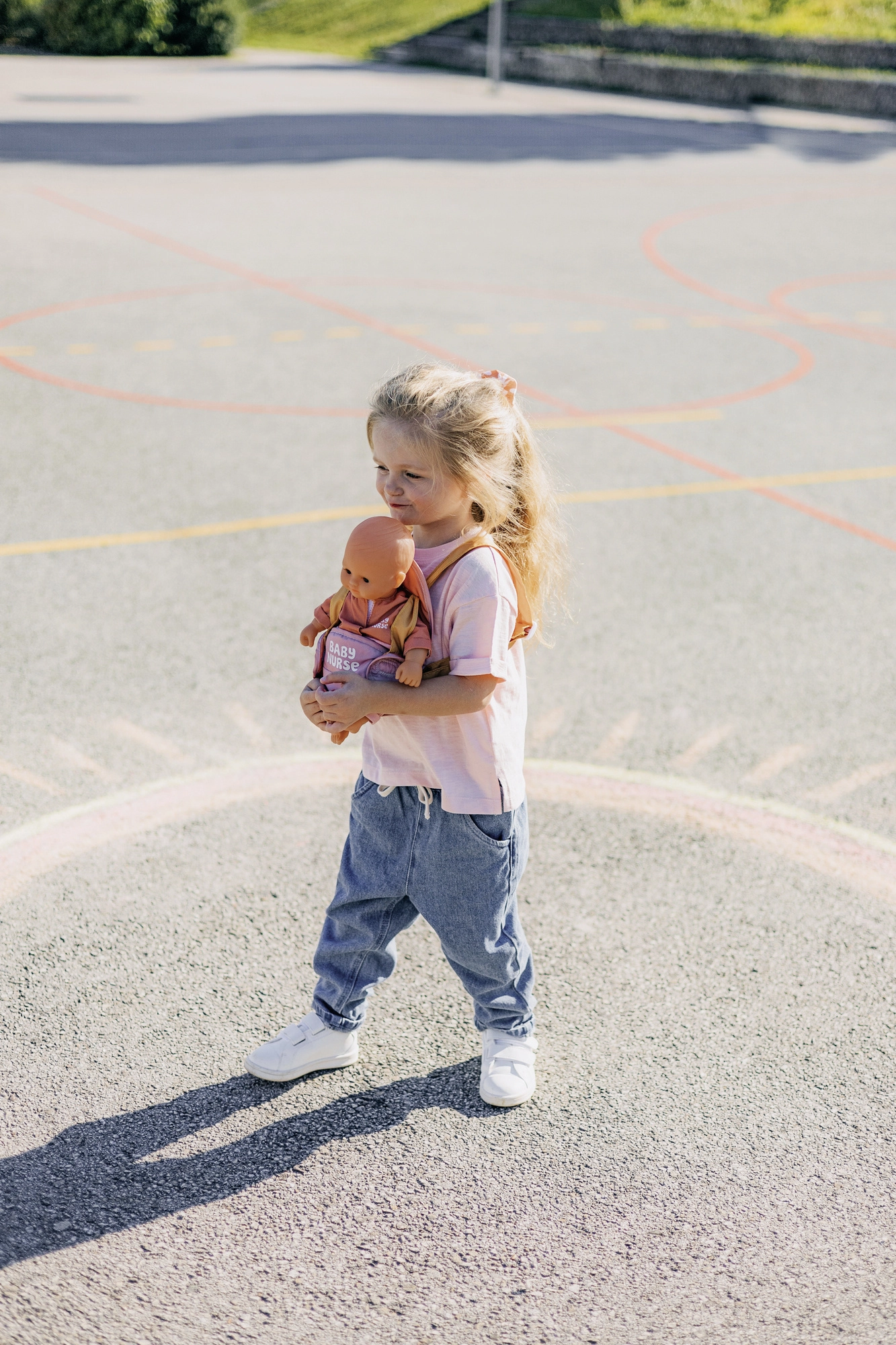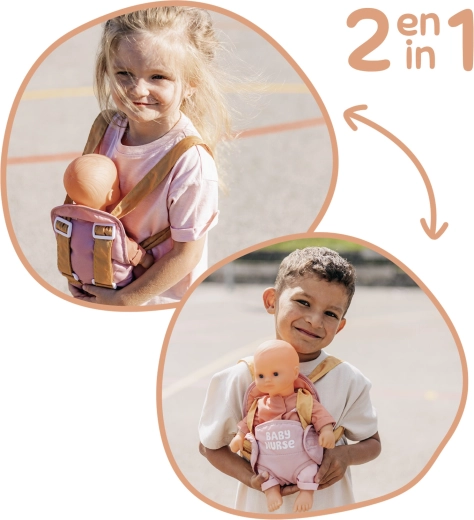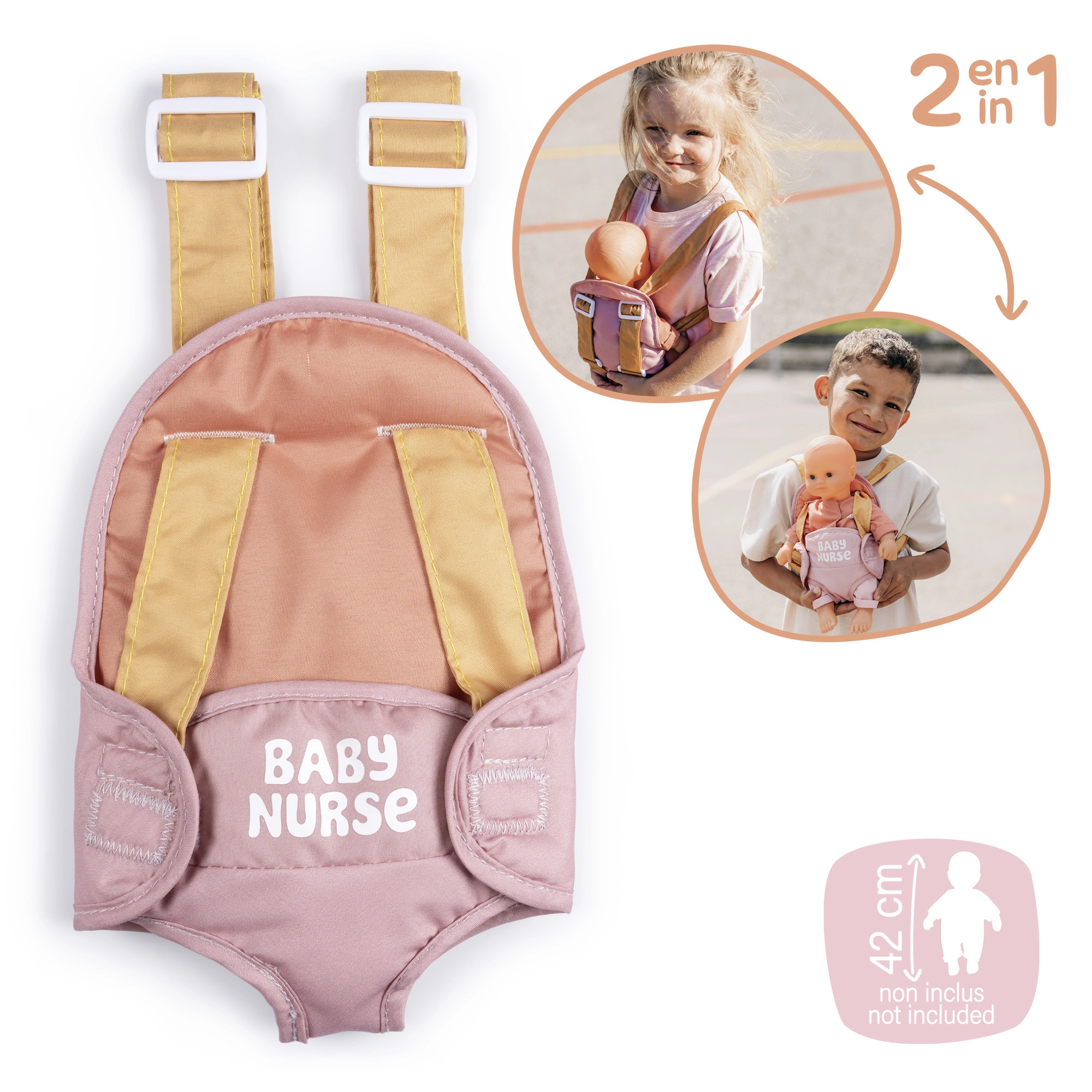 Nosiljka se lako prilagođava građi djeteta zahvaljujući podesivim naramenicama. Pastelna kombinacija ružičaste i oker boje djeluje nježno i moderno, pa savršeno upotpunjuje opremu za lutke BABY NURSE.