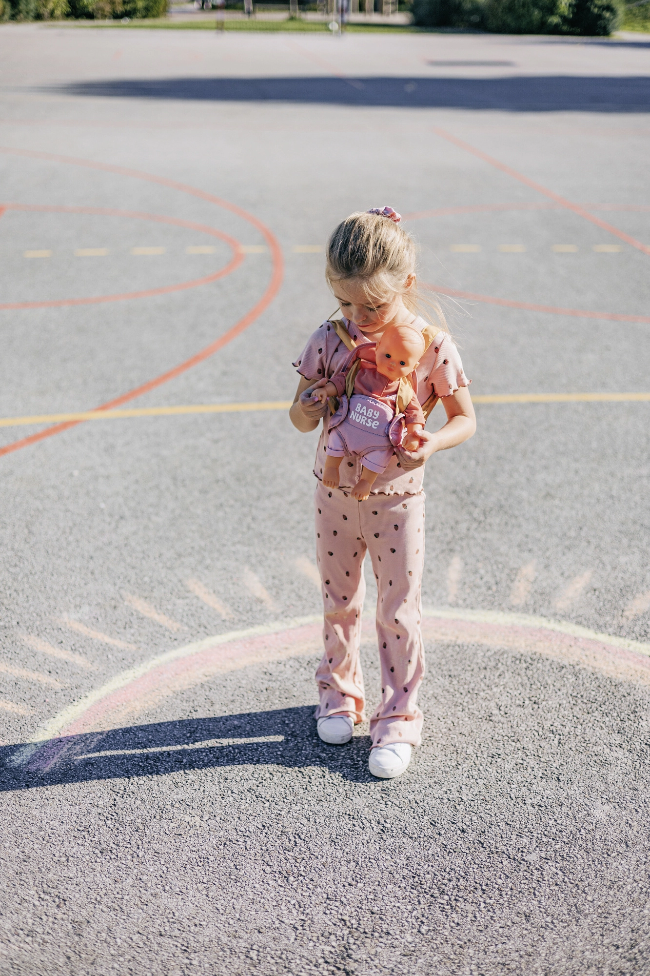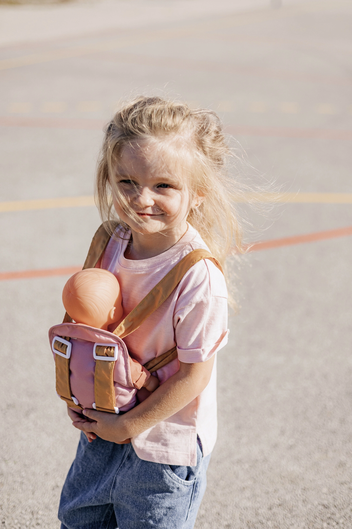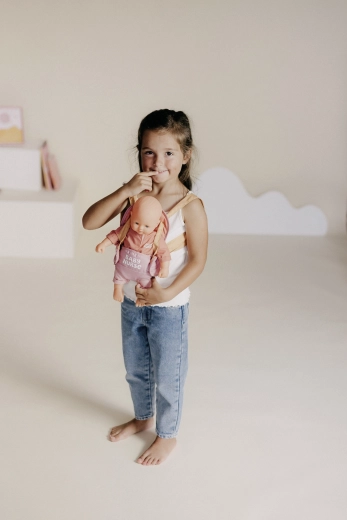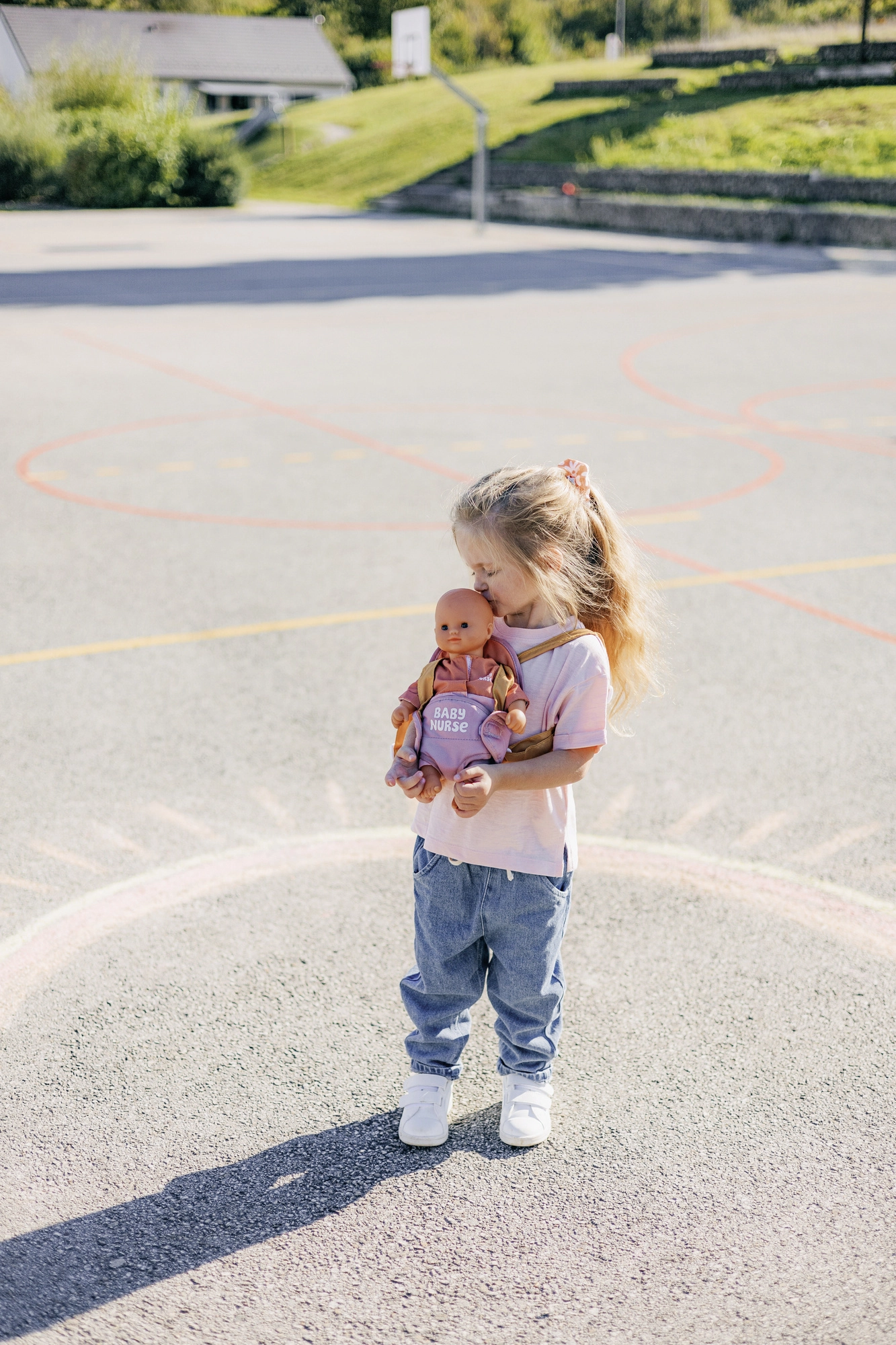 Nosiljka se lako prilagođava građi djeteta zahvaljujući podesivim naramenicama. Pastelna kombinacija ružičaste i oker boje djeluje nježno i moderno, pa savršeno upotpunjuje opremu za lutke BABY NURSE.