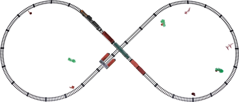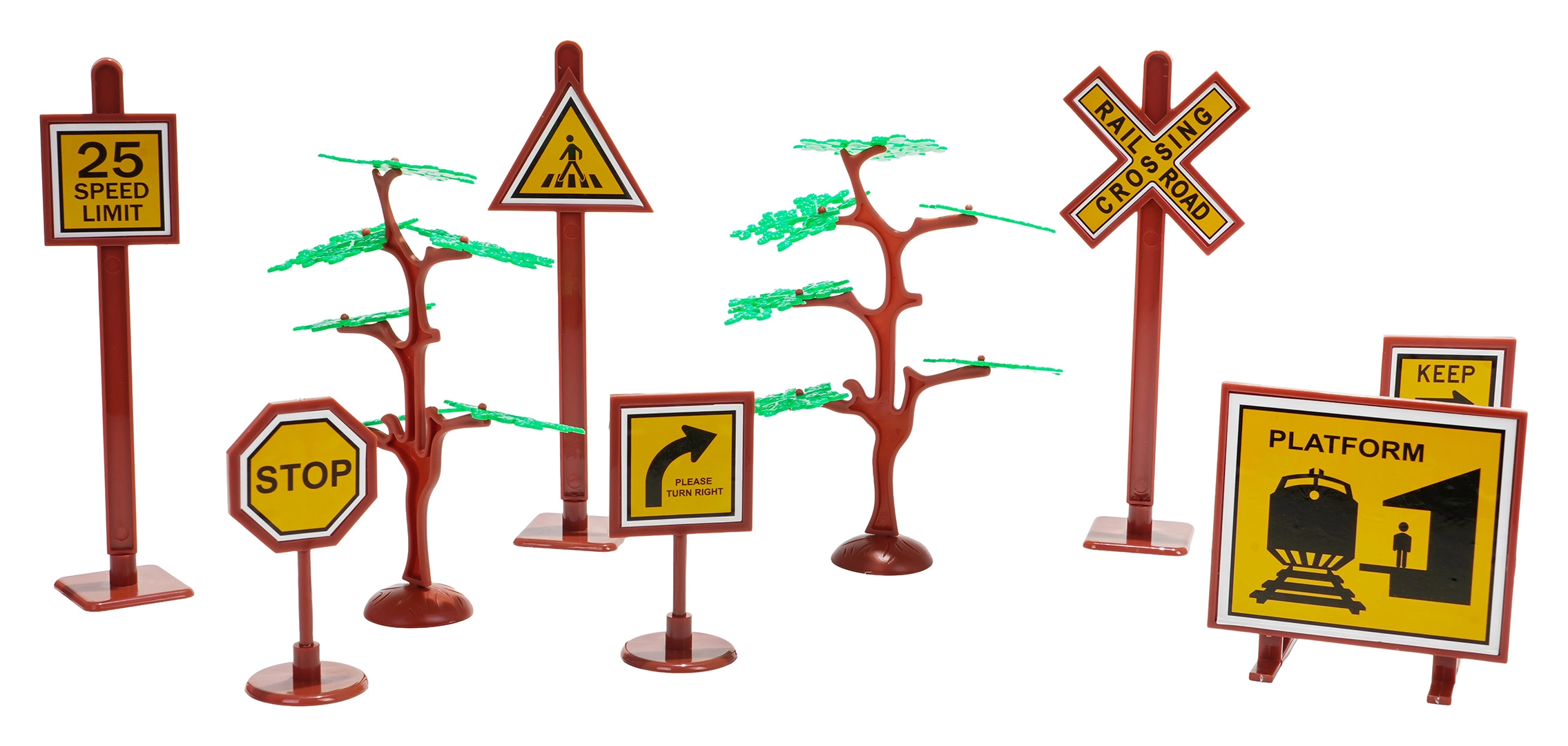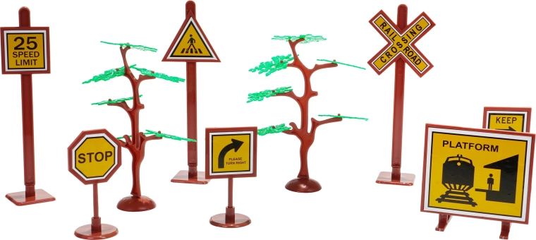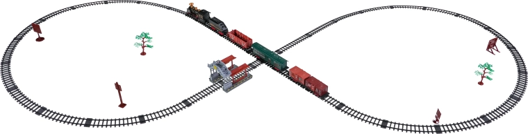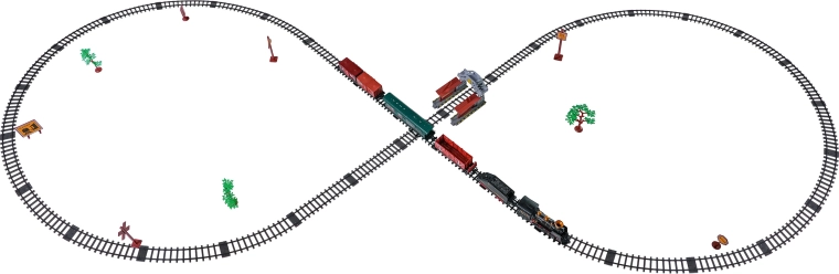 U pakiranju se nalazi lokomotiva s tendrom, putnički i teretni vagoni, znakovi i stabla – sve za kreativnu igru.