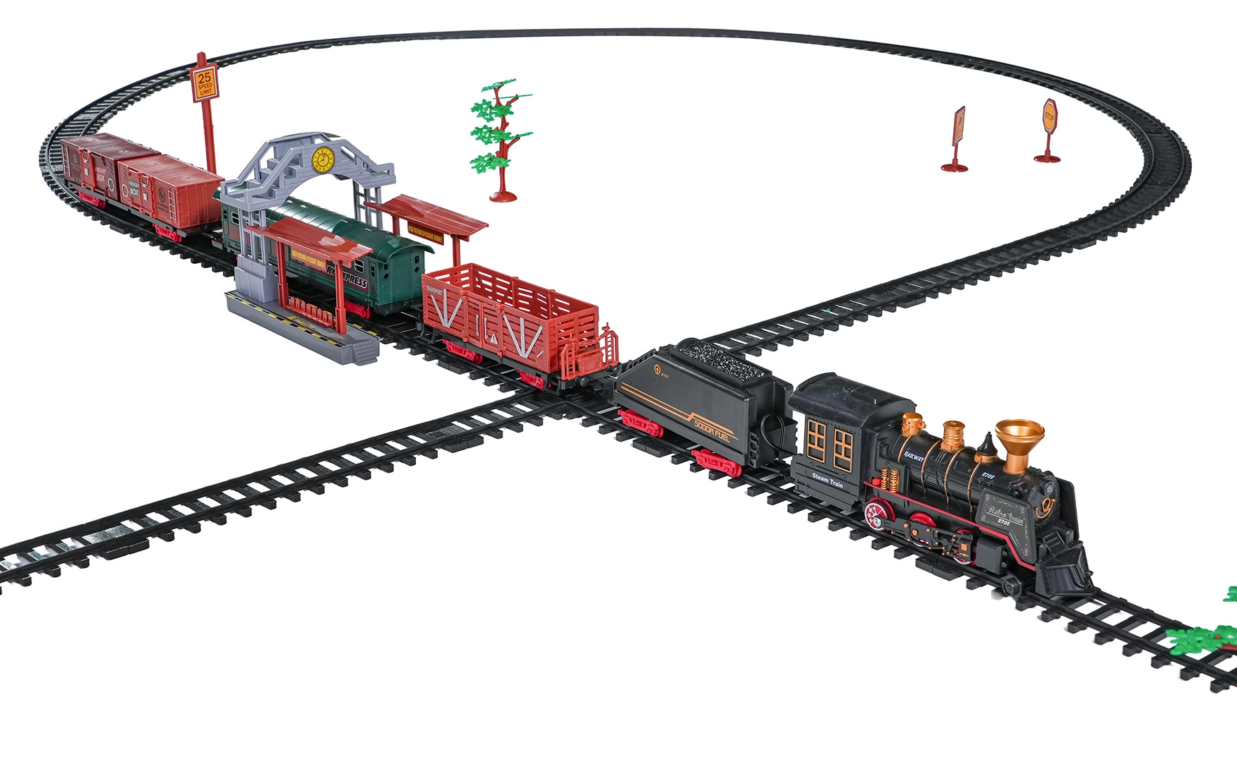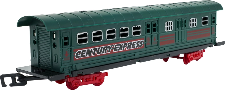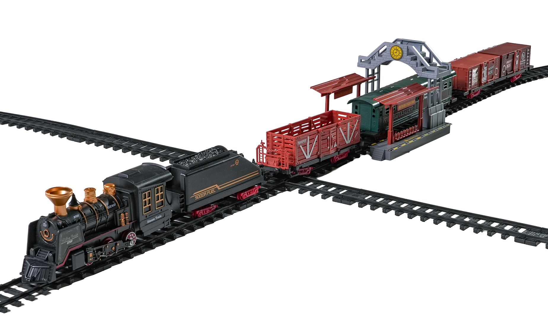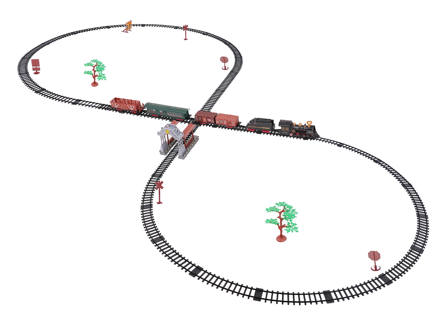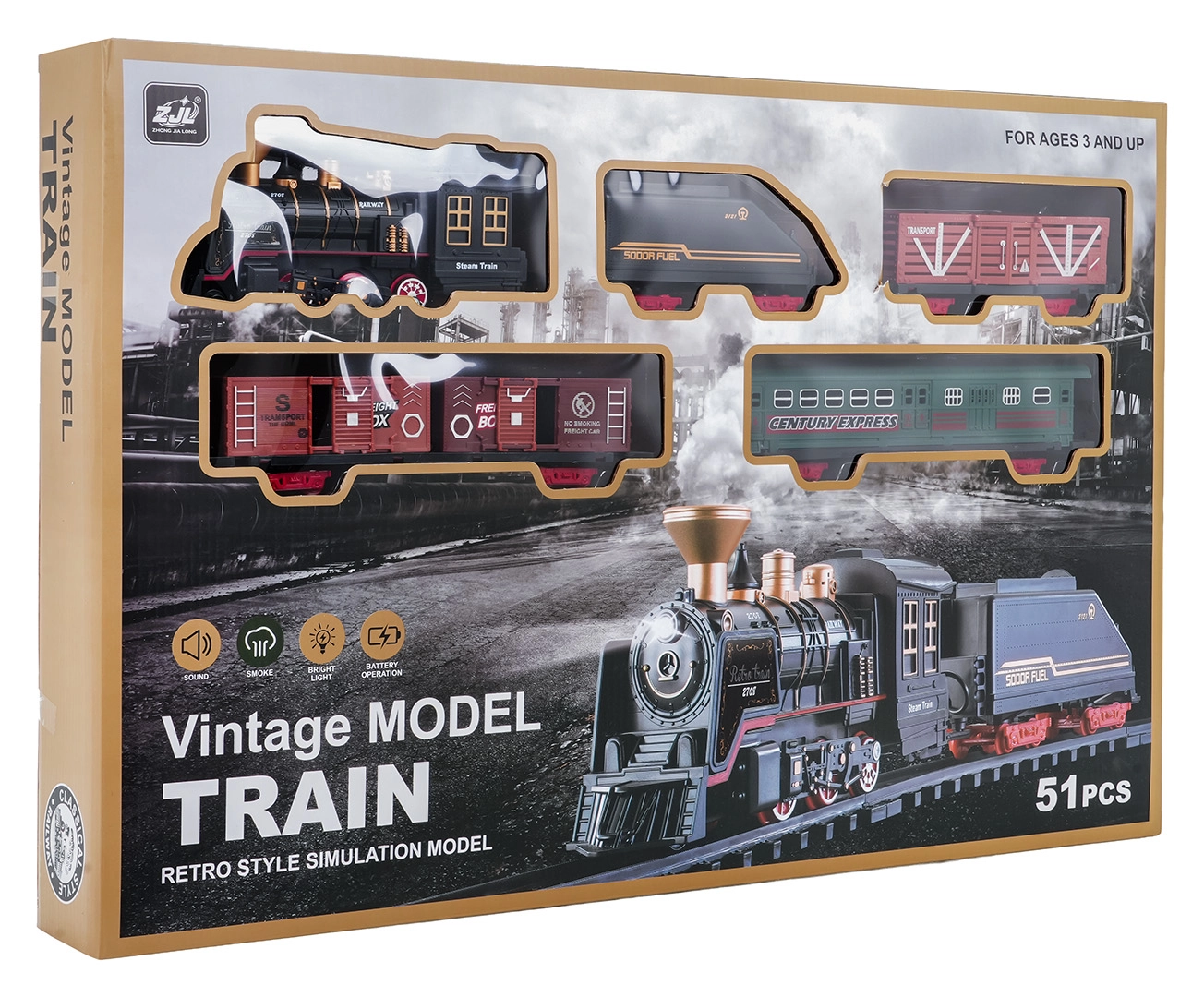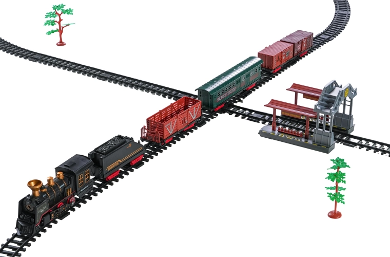 Dio pakiranja je kompletna vlakovna garnitura s lokomotivom, tendrom, putničkim i teretnim vagonima, setom tračnica te tematskim dodacima kao što su stabla i znakovi. Set potiče razvoj mašte, fine motorike i strpljenja te je idealan kao poklon za male zaljubljenike u željeznice.
