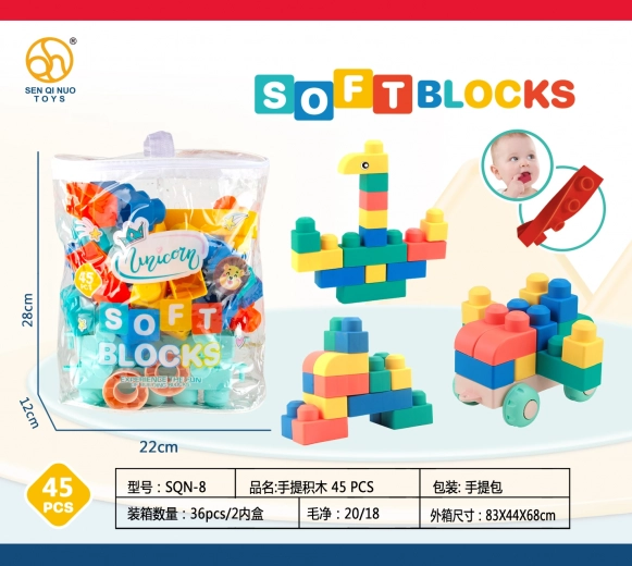 Ovaj šareni set mekih kocaka nudi 45 dijelova za sigurnu i razvojnu igru. Materijal je nježan prema djeci i okolišu, kocke su lagane, bez oštrih završetaka i nakon savijanja vraćaju se u prvotni oblik. Jednostavno održavanje – dovoljno ih je isprati ili prokuhati, boje ostaju postojano žive.