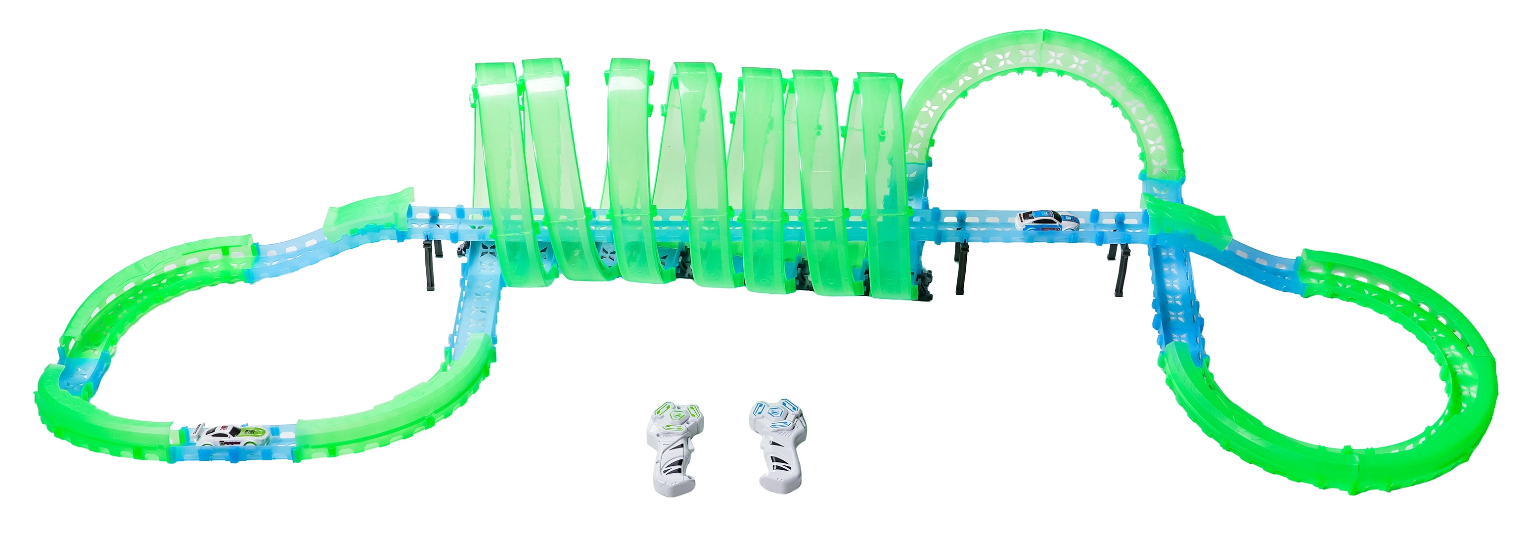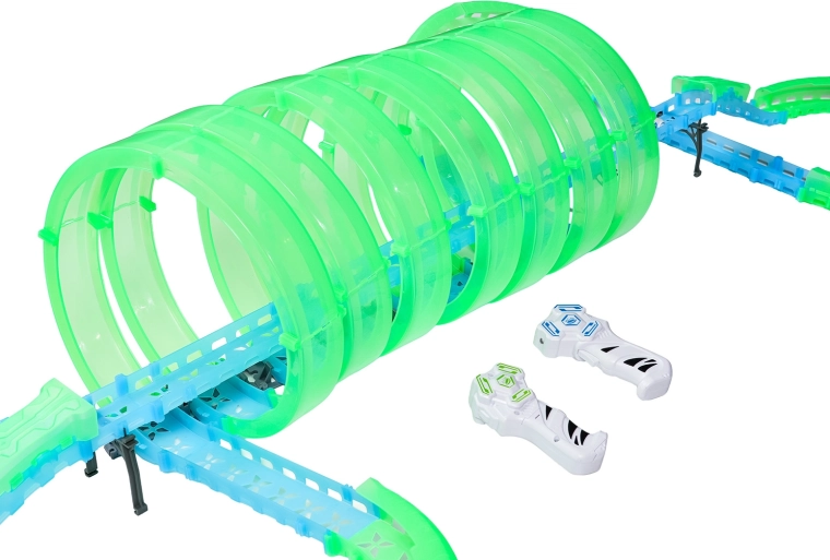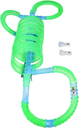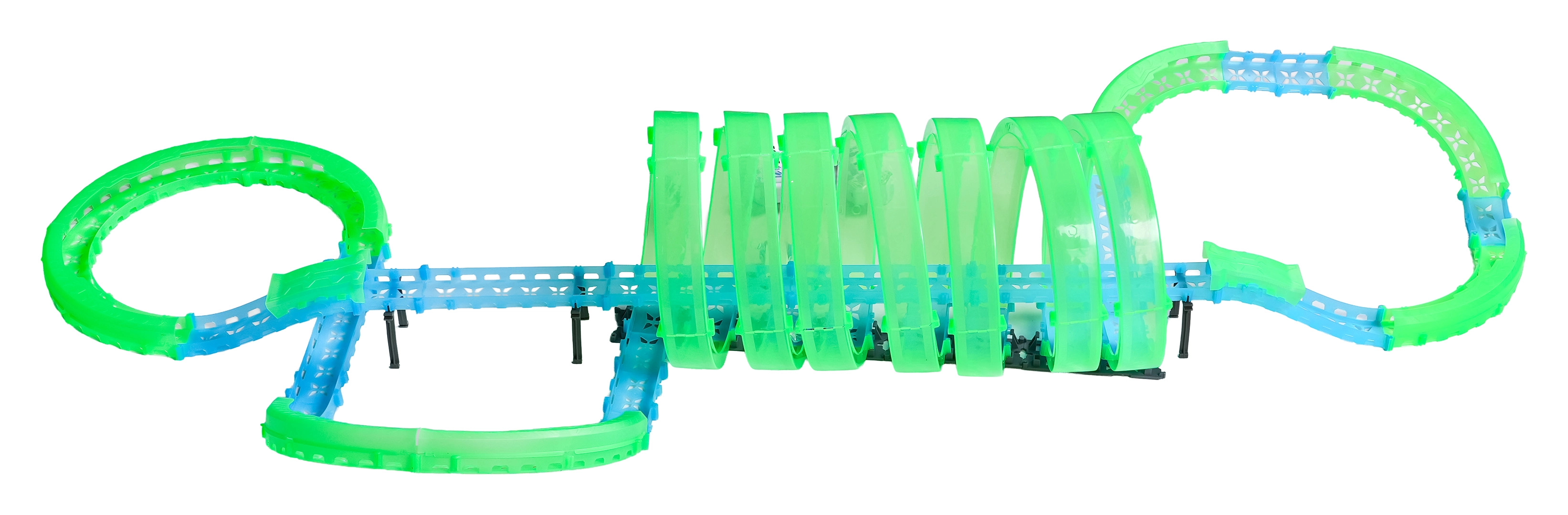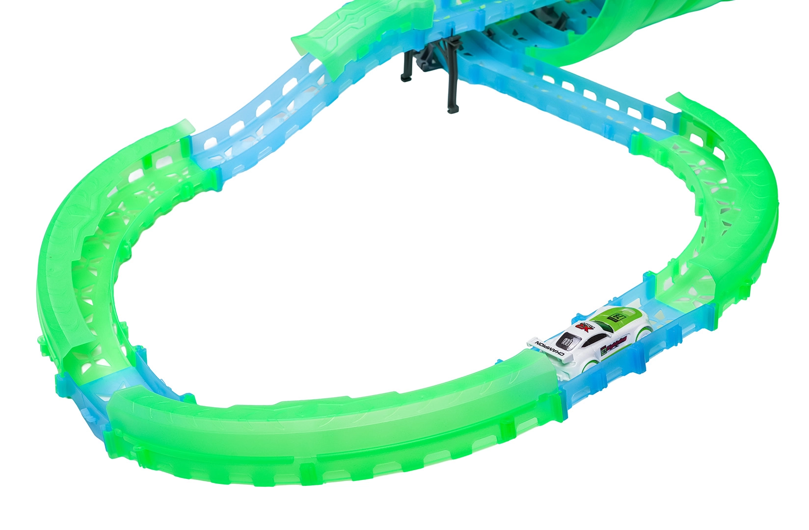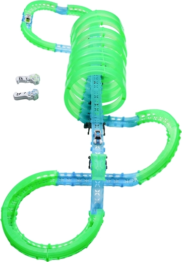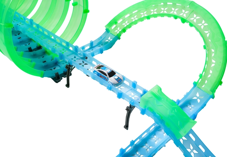 Ova modularna trkaća staza od svjetlovodnih dijelova u neonski zelenoj i plavoj boji lako se spaja na klik i omogućuje brze preinake. Fluorescentni materijal nakon izlaganja svjetlu zasja, a u kombinaciji s LED autićima pretvara sobu u atraktivnu svjetlosnu arenu.