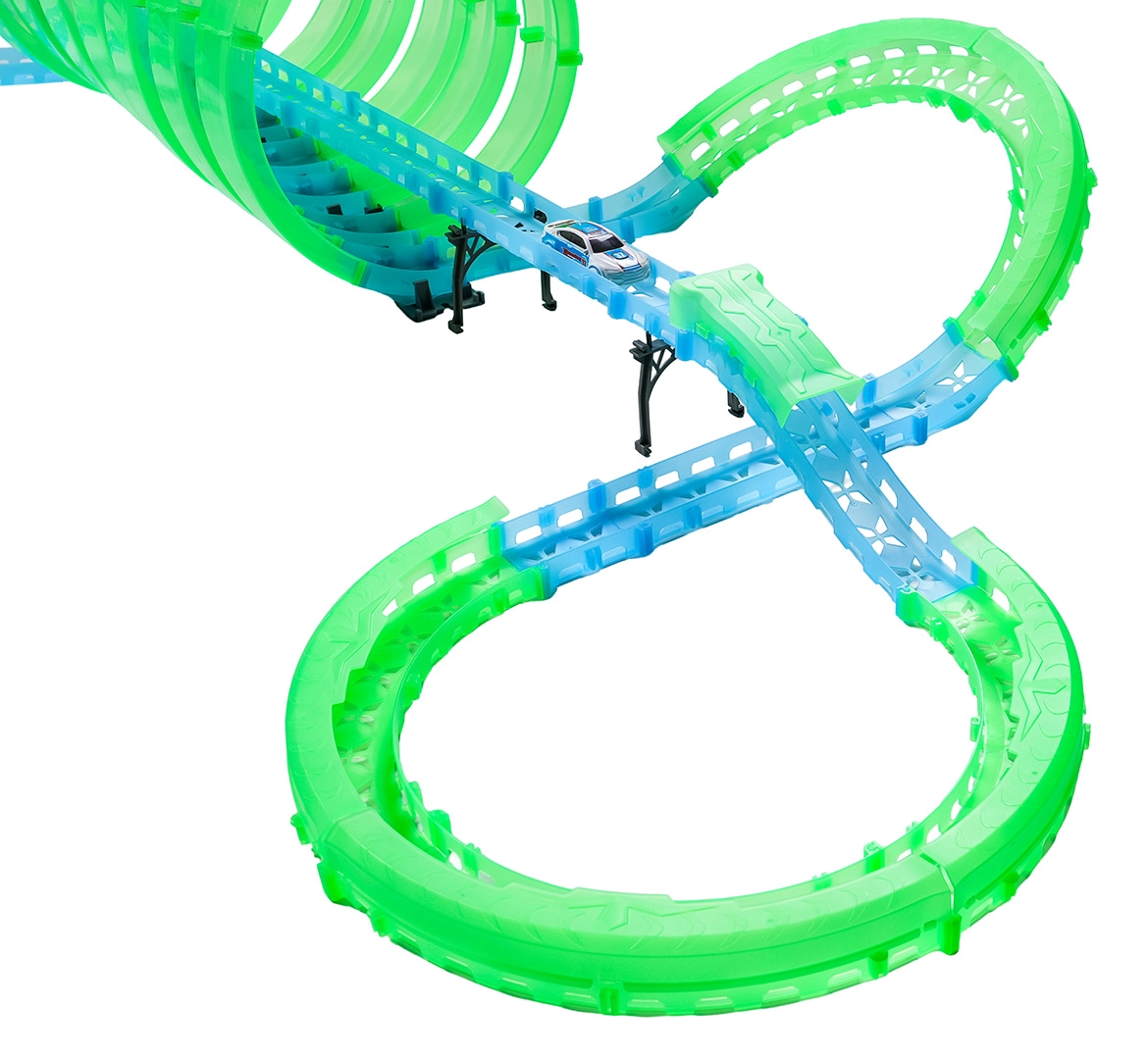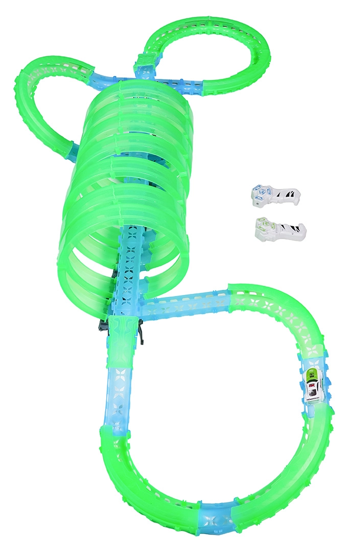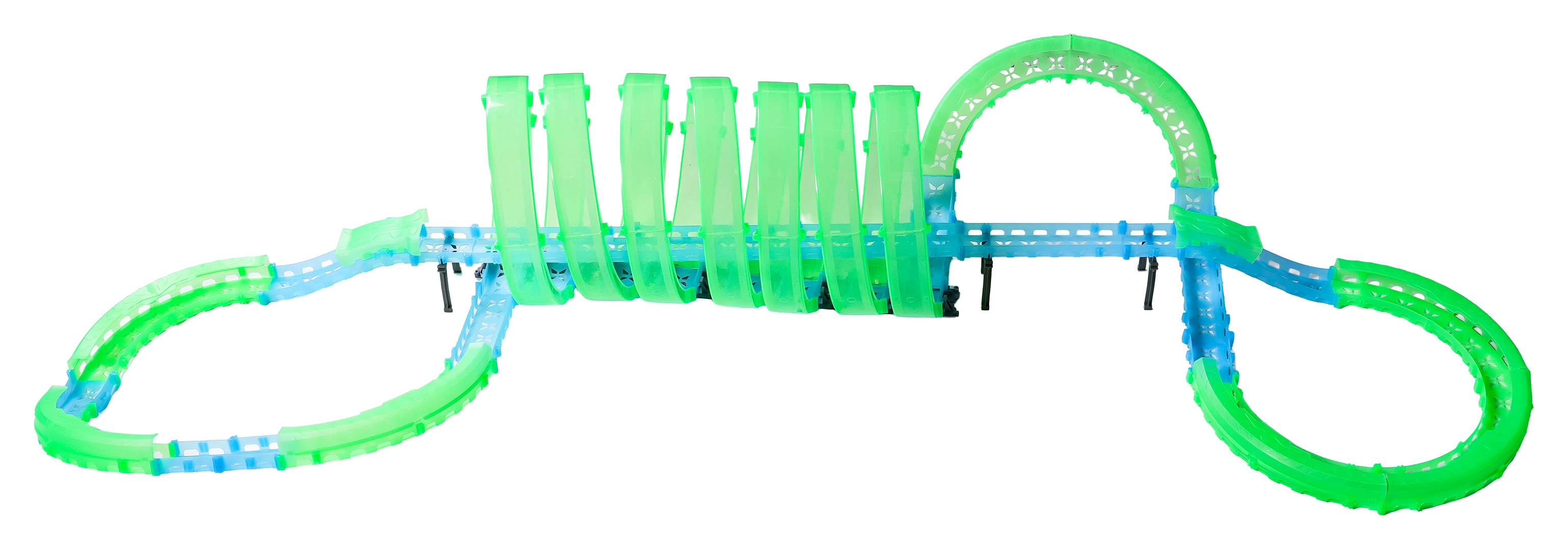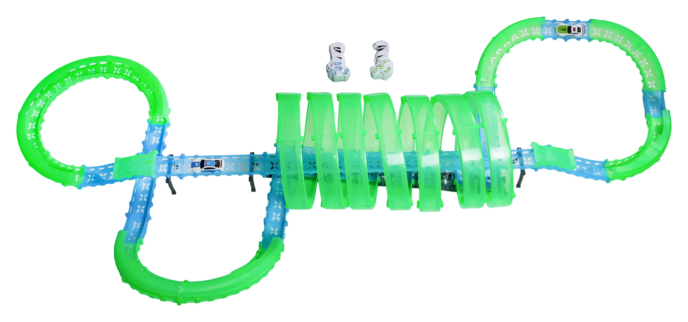 Ova modularna trkaća staza od svjetlovodnih dijelova u neonski zelenoj i plavoj boji lako se spaja na klik i omogućuje brze preinake. Fluorescentni materijal nakon izlaganja svjetlu zasja, a u kombinaciji s LED autićima pretvara sobu u atraktivnu svjetlosnu arenu.