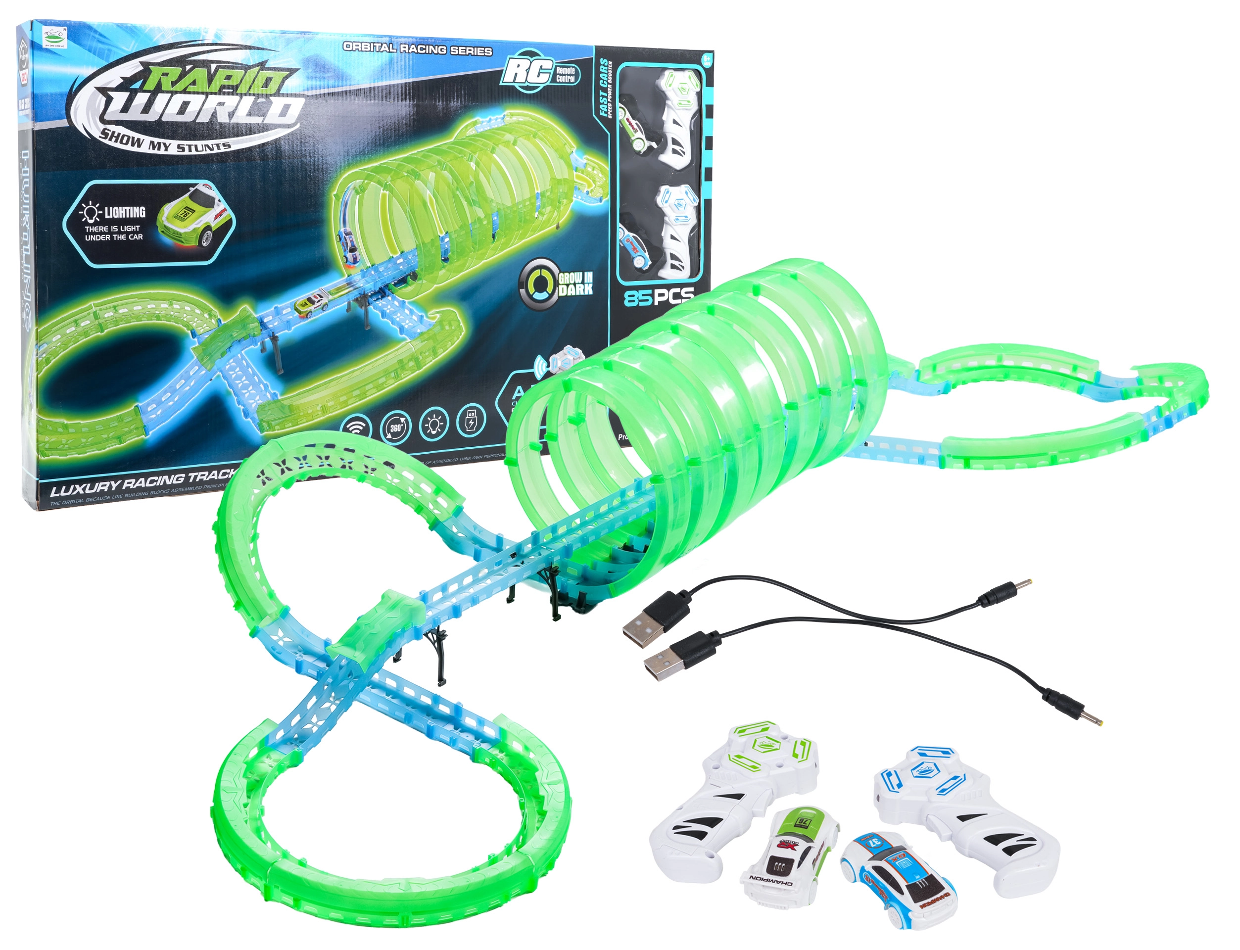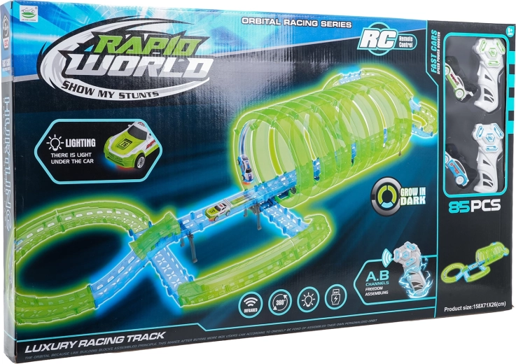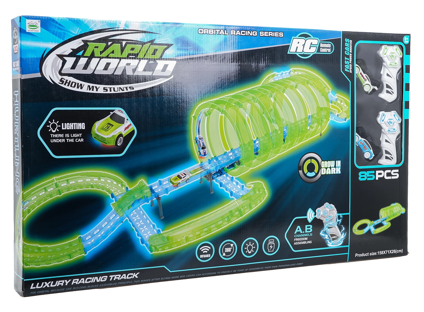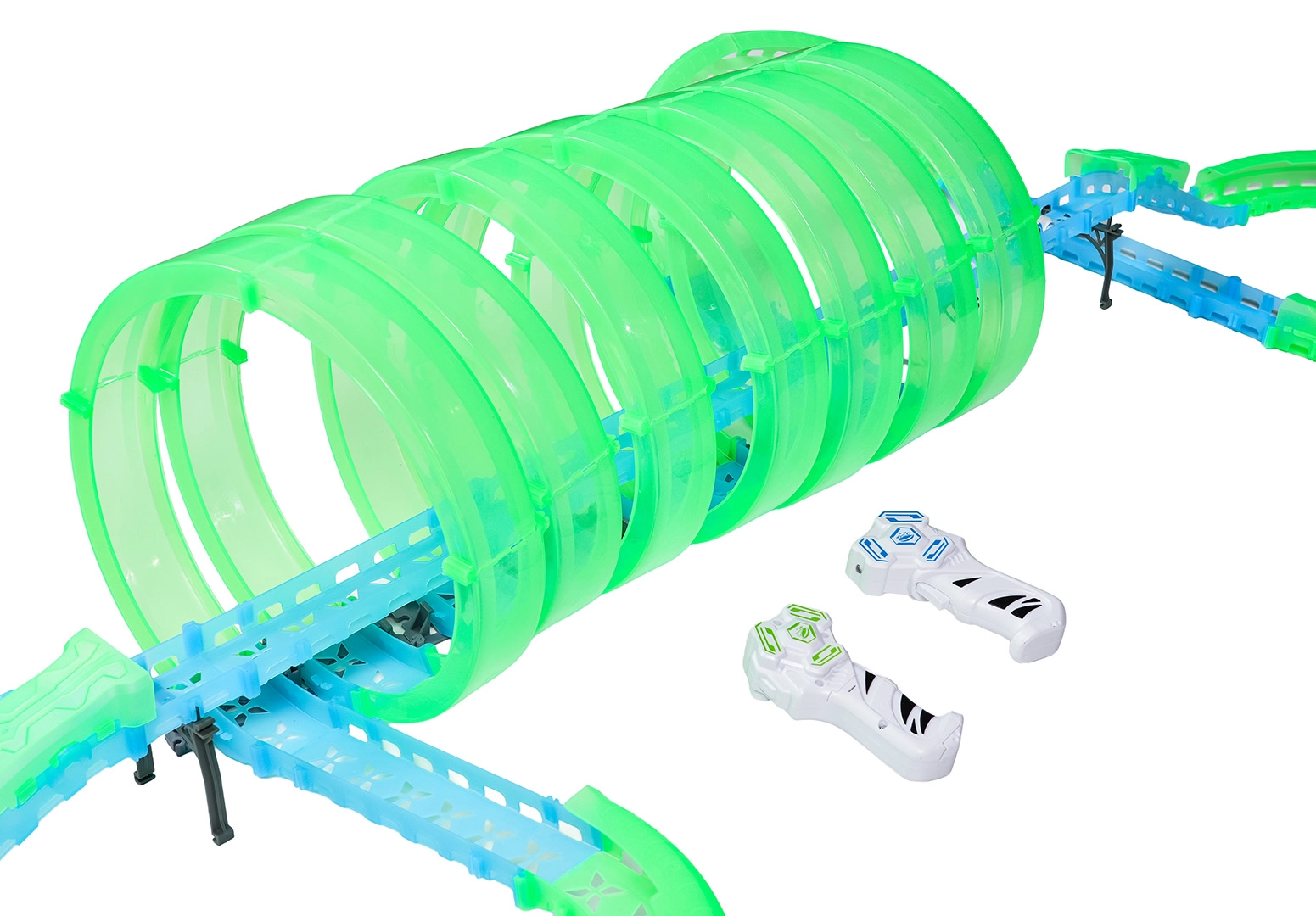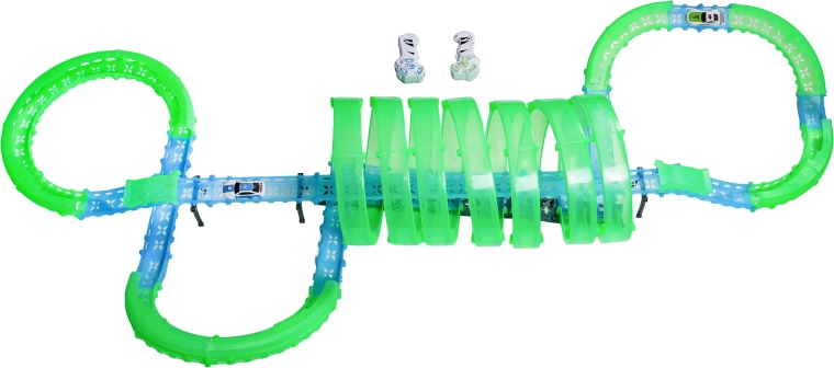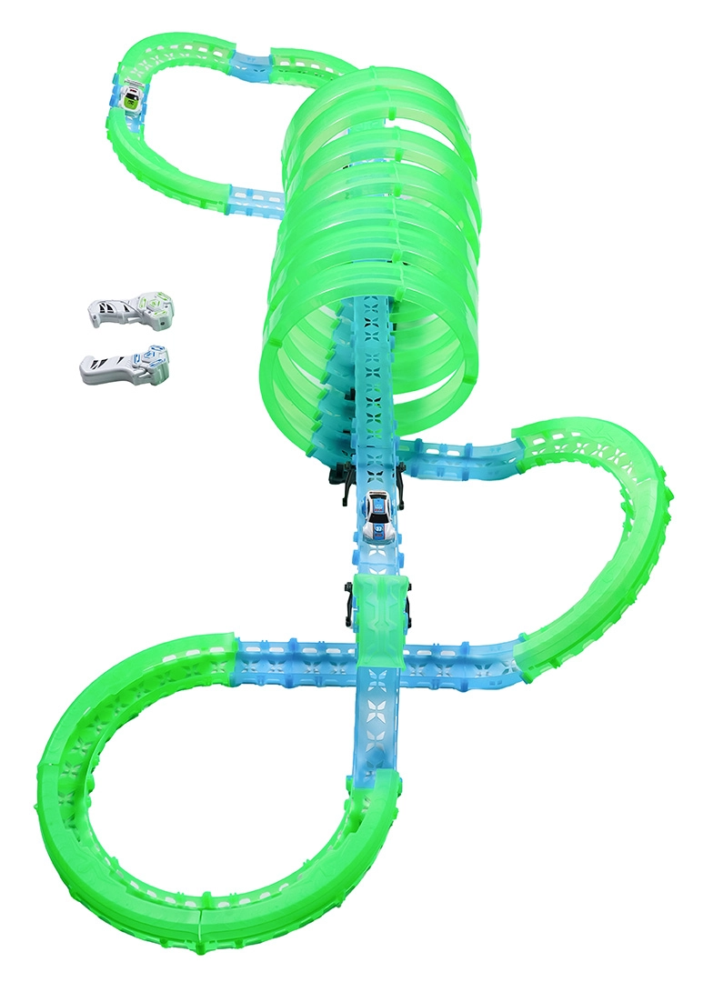 Ova modularna trkaća staza od svjetlovodnih dijelova u neonski zelenoj i plavoj boji lako se spaja na klik i omogućuje brze preinake. Fluorescentni materijal nakon izlaganja svjetlu zasja, a u kombinaciji s LED autićima pretvara sobu u atraktivnu svjetlosnu arenu.