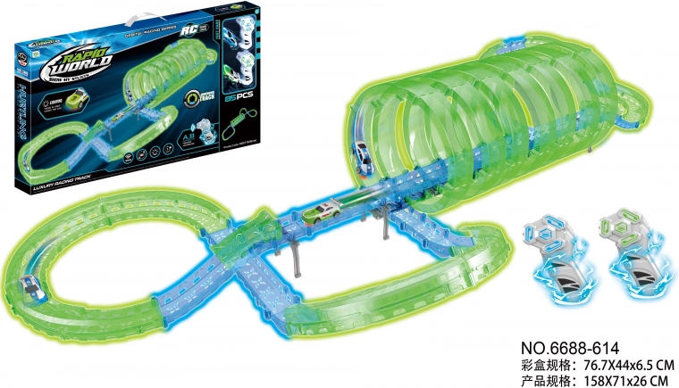 Velika trkaća staza za djecu od 6 godina donosi akcijsku zabavu s dva autića na daljinsko upravljanje. Staza je fluorescentna i svijetli u mraku, autići imaju LED pozadinsko osvjetljenje i stvaraju dojmljive svjetlosne efekte. Zahvaljujući 360° petljama i jednostavnoj slagalici razvijaju se koordinacija, mašta i fina motorika djece.