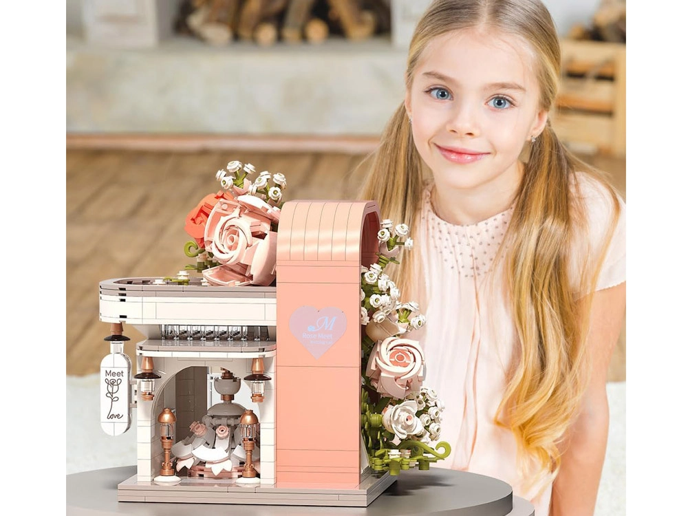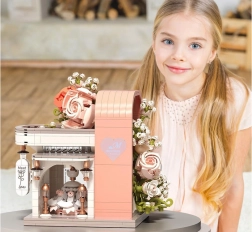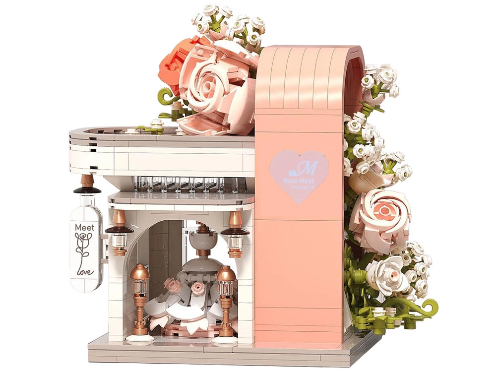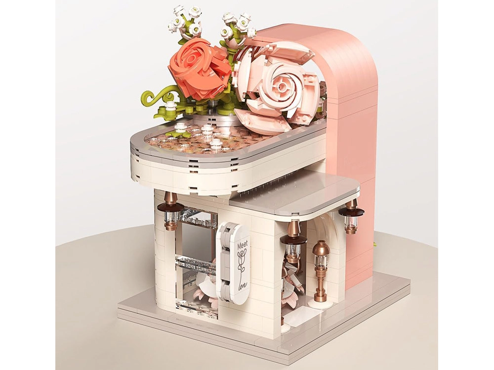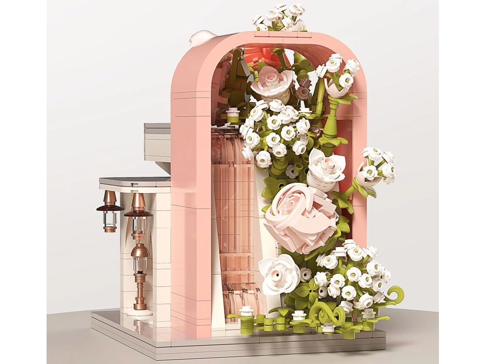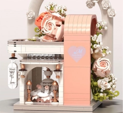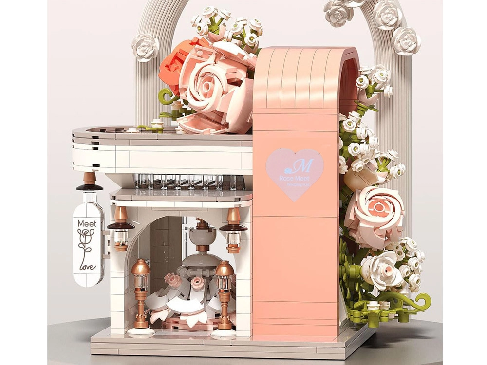 Ovaj romantični set pretvara vaš stol u slikovitu svadbenu scenu. Elegantni izlog s „ostakljenim“ pročeljem otkriva glavnu zvijezdu – svadbenu haljinu s nježnim ružičastim detaljima koji se slažu s bijelom, puderasto ružičastom i pastelnom zelenom. Konstrukciju obavijaju raskošne cvjetne girlande, ukrasi na krovu i sitne lampe pri ulazu, zahvaljujući kojima model djeluje poput bajkovitog izloga.