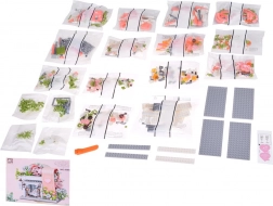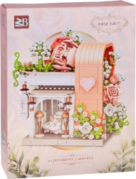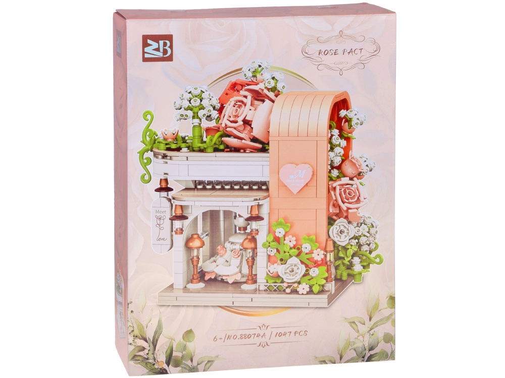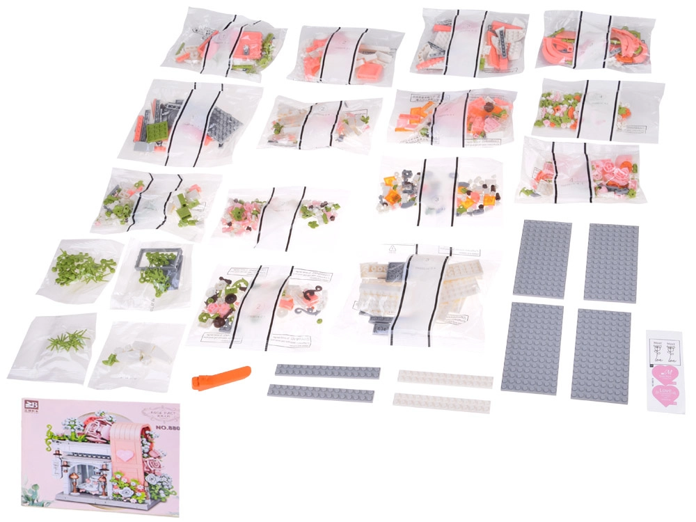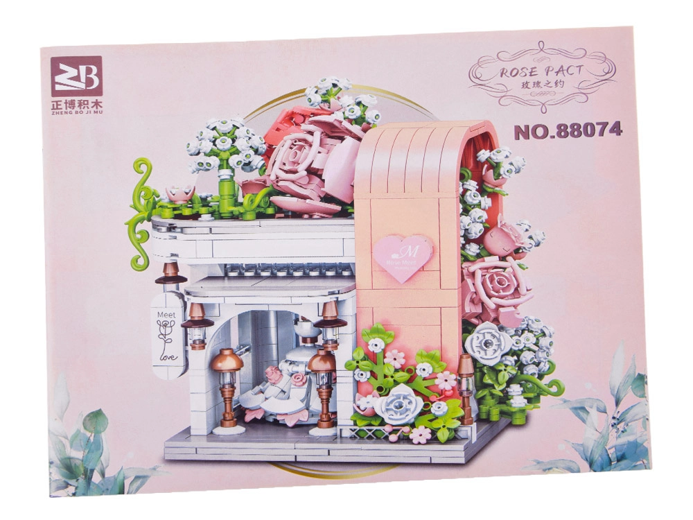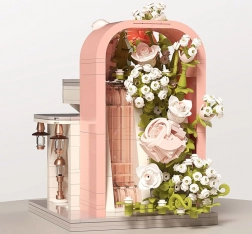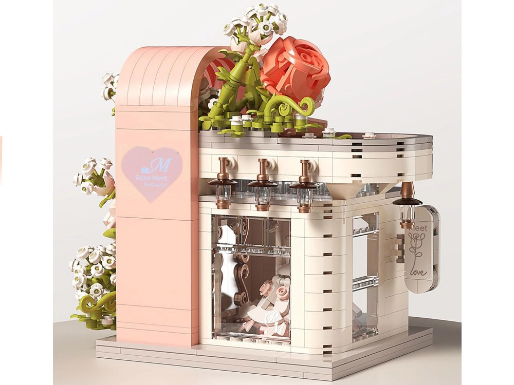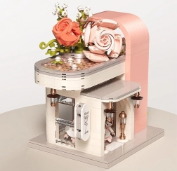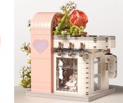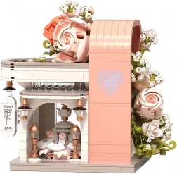 Ovaj romantični set pretvara vaš stol u slikovitu svadbenu scenu. Elegantni izlog s „ostakljenim“ pročeljem otkriva glavnu zvijezdu – svadbenu haljinu s nježnim ružičastim detaljima koji se slažu s bijelom, puderasto ružičastom i pastelnom zelenom. Konstrukciju obavijaju raskošne cvjetne girlande, ukrasi na krovu i sitne lampe pri ulazu, zahvaljujući kojima model djeluje poput bajkovitog izloga.