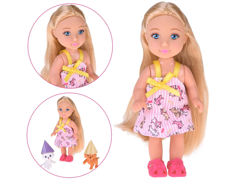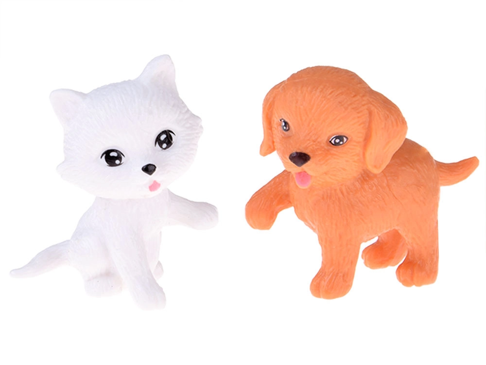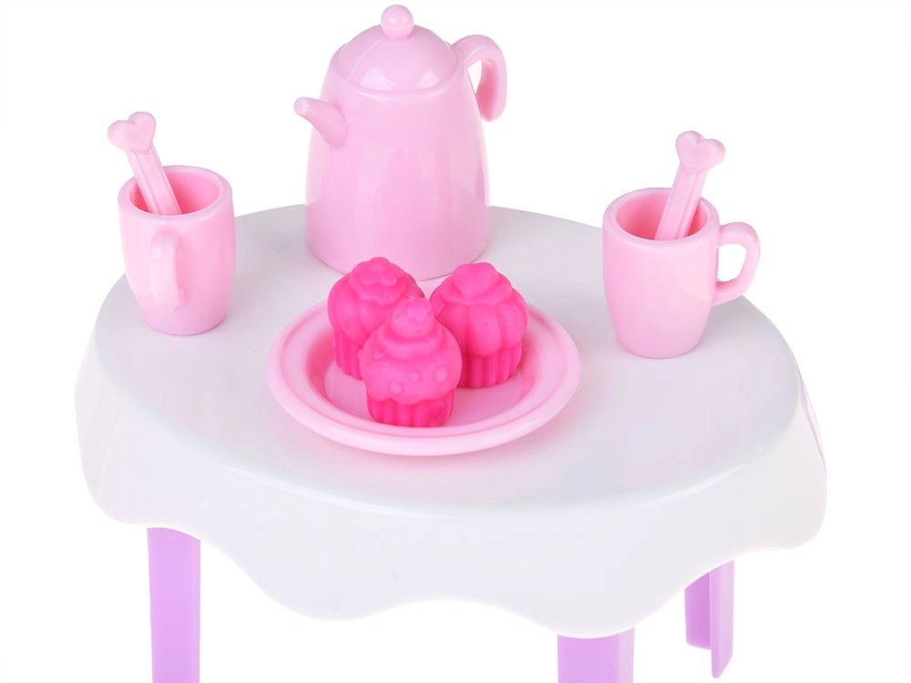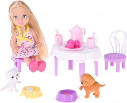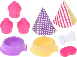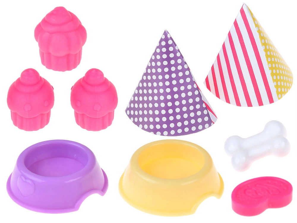 lutka, mačkica, psić, stolić, 2× stolica, 2× tanjur, 2× zdjelica, 2× šalica, 2× žlica, 2× žličica, 2× nož, 2× vilica, čajnik s poklopcem, 2× zdjelica za ljubimce, 3× cupcake, 2× papirnata party kapica, kost, poslastica