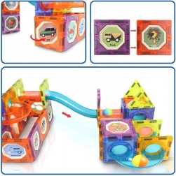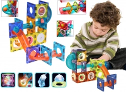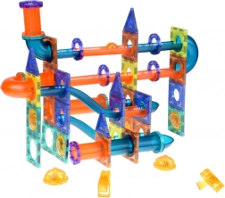 Ovaj veliki magnetski set kombinira prozirne panele, cijevi i zakrivljene dijelove za izradu fluidnih staza niz koje se kugle spuštaju s kata na kat. Jaka magnetska spajanja drže stabilno, pa djeca bez brige mogu isprobavati nove varijante i usavršavati svoju konstrukciju. Svjetleće kuglice, reflektori i kupolaste lampice obasjavaju stazu i pretvaraju igru u magični svjetlosni show.