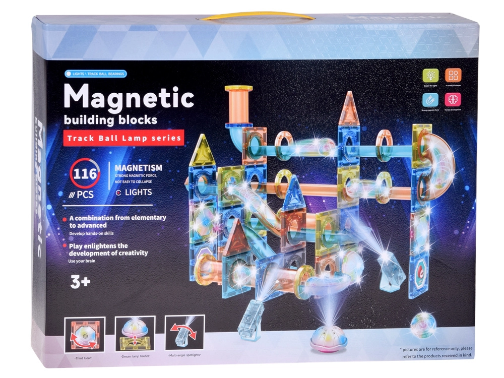Kreativni magnetski set sa svjetlosnim elementima i prozirnim cijevima omogućuje djeci izgradnju kuglične staze, tornjeva i tunela. Zahvaljujući 116 dijelova sa jakim magnetima slaganje je jednostavno i intuitivno, svjetleće kuglice i reflektori daju konstrukcijama efektan doživljaj posebno u polumraku. Odlično za STEM učenje, razvoj logike i fine motorike.