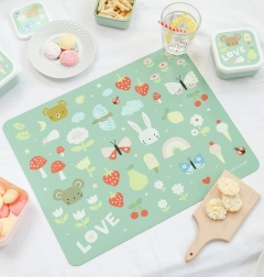 Praktična dječja prostirka u intenzivno zelenoj boji s razigranim motivom pristaje na svaki stol. Zahvaljujući izdržljivom vinilu lako se čisti, dugotrajno izgleda odlično i štiti površinu stola pri svakodnevnoj upotrebi.