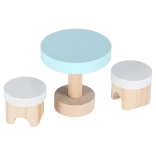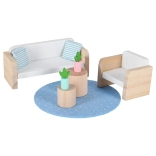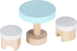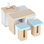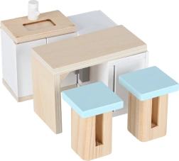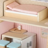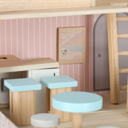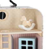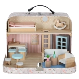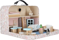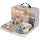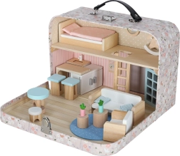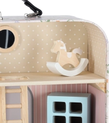 Ova mini kućica za lutke u kovčežiću nakon otvaranja pretvara se u dvokatni interijer s kuhinjom, dnevnim boravkom i spavaćom sobom. Nježne pastelne boje u kombinaciji s prirodnim drvom stvaraju ugodnu atmosferu i pozivaju na maštovitu igru s lutkama ili figuricama.