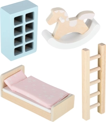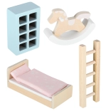 - Set od 25 dijelova namještaja: krevet s posteljinom, sofa i naslonjač, stolići i stolci, police, kuhinjski sudoper, komoda, dekoracije, tepih i konjić za ljuljanje.