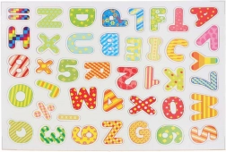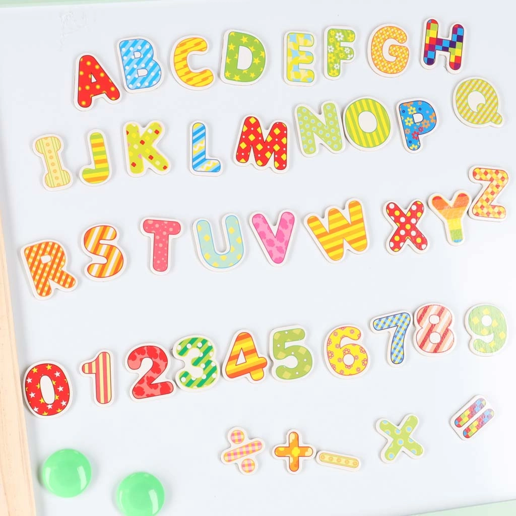 - Drvena obostrana ploča 3u1 s 2 tekstilne košare, 6× kreda, 6× voštana bojica, 2× magnet, 3× magnetski marker, spužvica za brisanje, 41 magnet (slova i brojke)