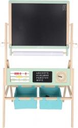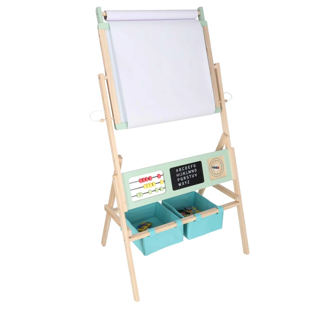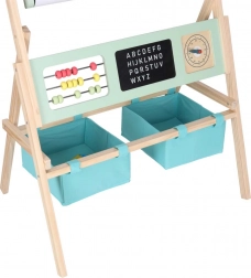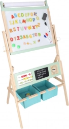 Drvena konstrukcija je stabilna i izdržljiva, a dva tekstilna pretinca drže sav pribor pri ruci. Set uključuje i krede, voštane bojice, magnetske markere, spužvicu za brisanje te magnete – dovoljno je raspakirati i stvarati.