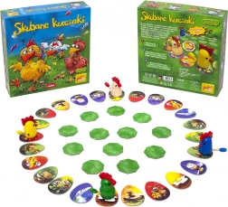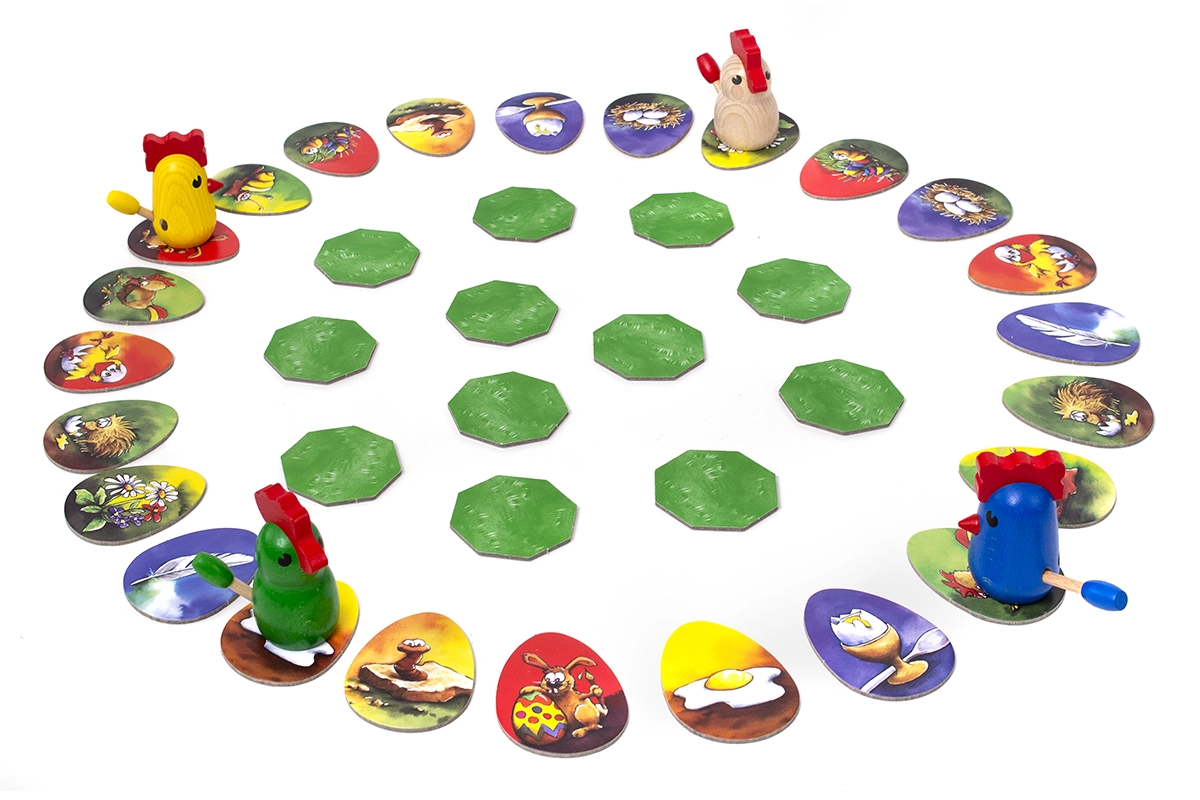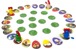 Sadržaj pakiranja: 24 pločice s jajima, 12 osmerokutnih pločica kokošinjca, 4 figure pilića, 4 repna perca, pravila igre.