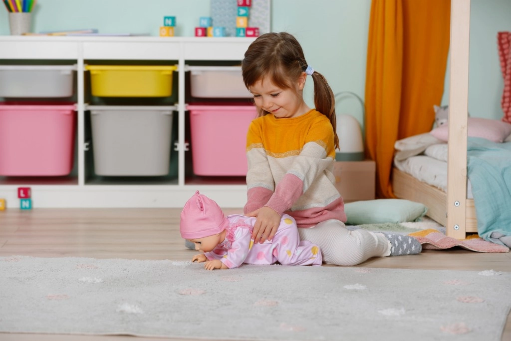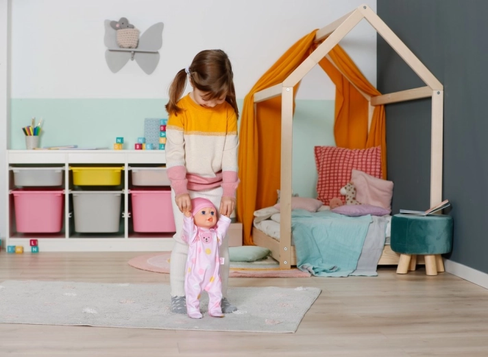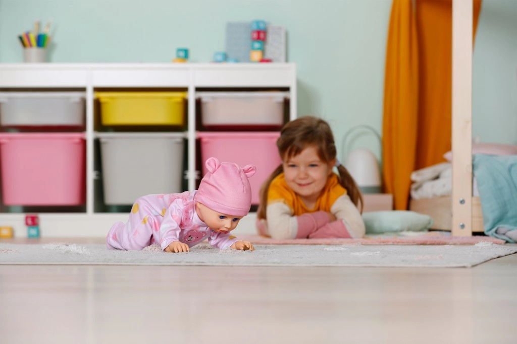 Lutka BABY born Emily potiče djecu na kretanje i kreativnost – jednostavan i siguran mehanizam omogućuje da lutka potrči ili puže po podu. Djeca tako mogu oponašati brigu o bebi, smišljati priče i istovremeno razvijati finu i grubu motoriku.