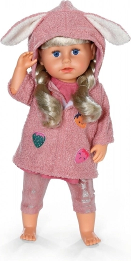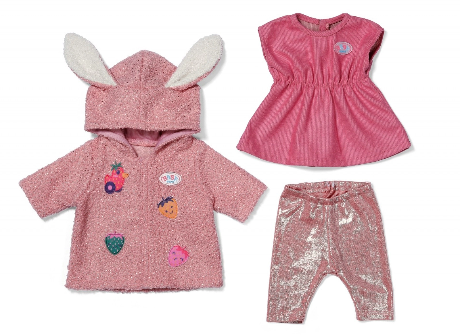 Stilizan outfit za lutke BABY born 43 cm uključuje mekani ružičasti kaputić s kapuljačom i ušima, haljinicu i sjajne tajice. Savršeno za presvlačenje, kreativnu igru i moderan izgled vaše omiljene lutke.