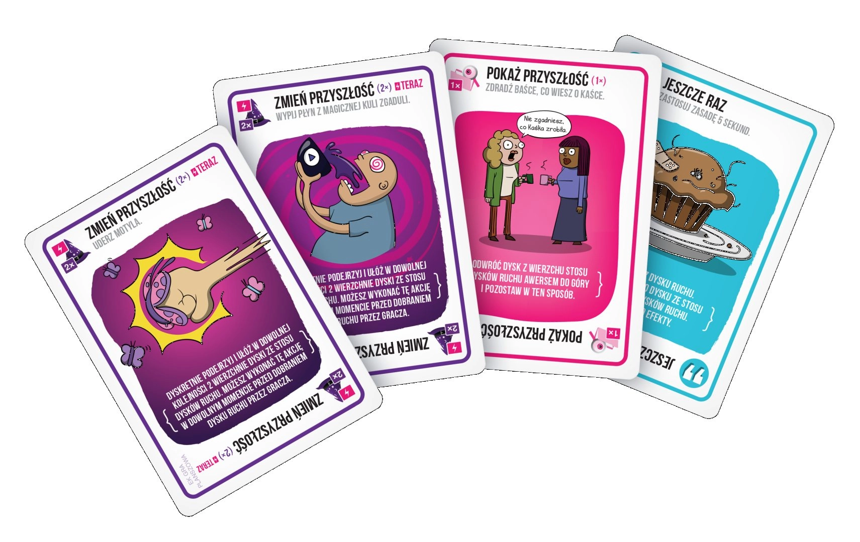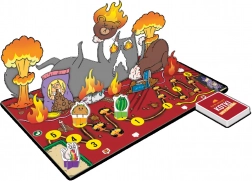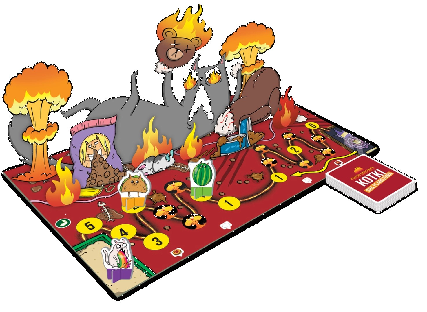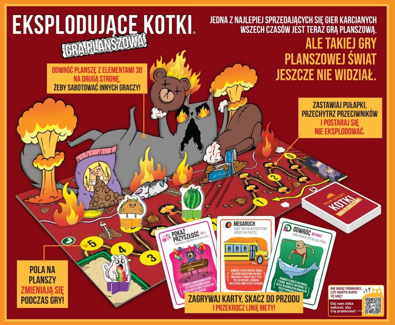 Eksplodirajuće mačke: društvena igra prenosi divlju energiju popularnog kartaškog predloška na igraću ploču. Igrači se izmjenjuju u igranju akcijskih karata i izvlačenju pomičnih diskova kako bi napredovali stazom i stigli na ciljno polje. Putem ih čekaju zamke i sabotaže protivnika koje se mogu preživjeti samo pametnom upotrebom karata za neutralizaciju.