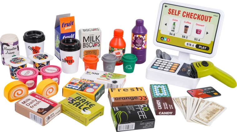 Set je izrađen od kvalitetne, izdržljive plastike u živim bojama. Ne nedostaje aparat za kavu s kapsulama i čašama, mnoštvo pakiranja s „prehrambenim proizvodima” te praktične pretince za uredno slaganje. Skener ima svjetlosne i zvučne efekte, a blagajna ispušta zvukove pri pritisku tipki i pri plaćanju karticom.